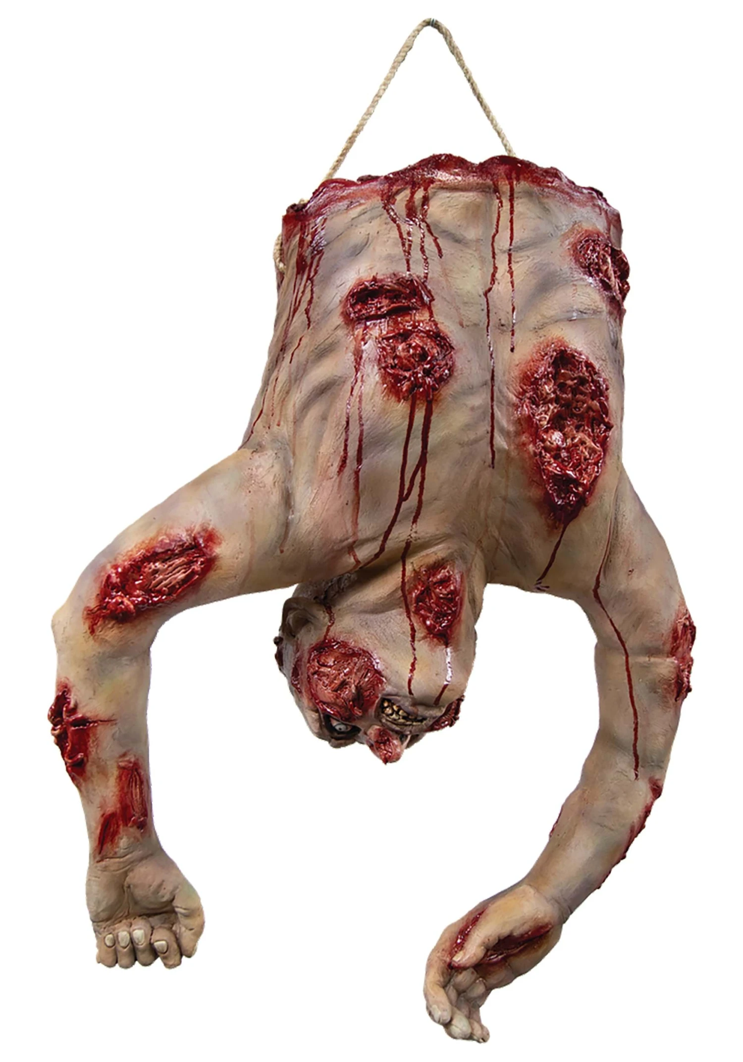 This macabre décor features a truly graphic scene. It is designed to look like the upper body of a human male that has been brutally separated from his lower half. Made to look like it is hanging upside down, it is covered in several terrible wounds that still look quite fresh. Blood drips out of the gruesome tears and rips of this poor soul’s flesh. By the look on this corpse’s face, it wasn’t a slow death. It will serve as a startling warning for anyone that steps foot on your property!