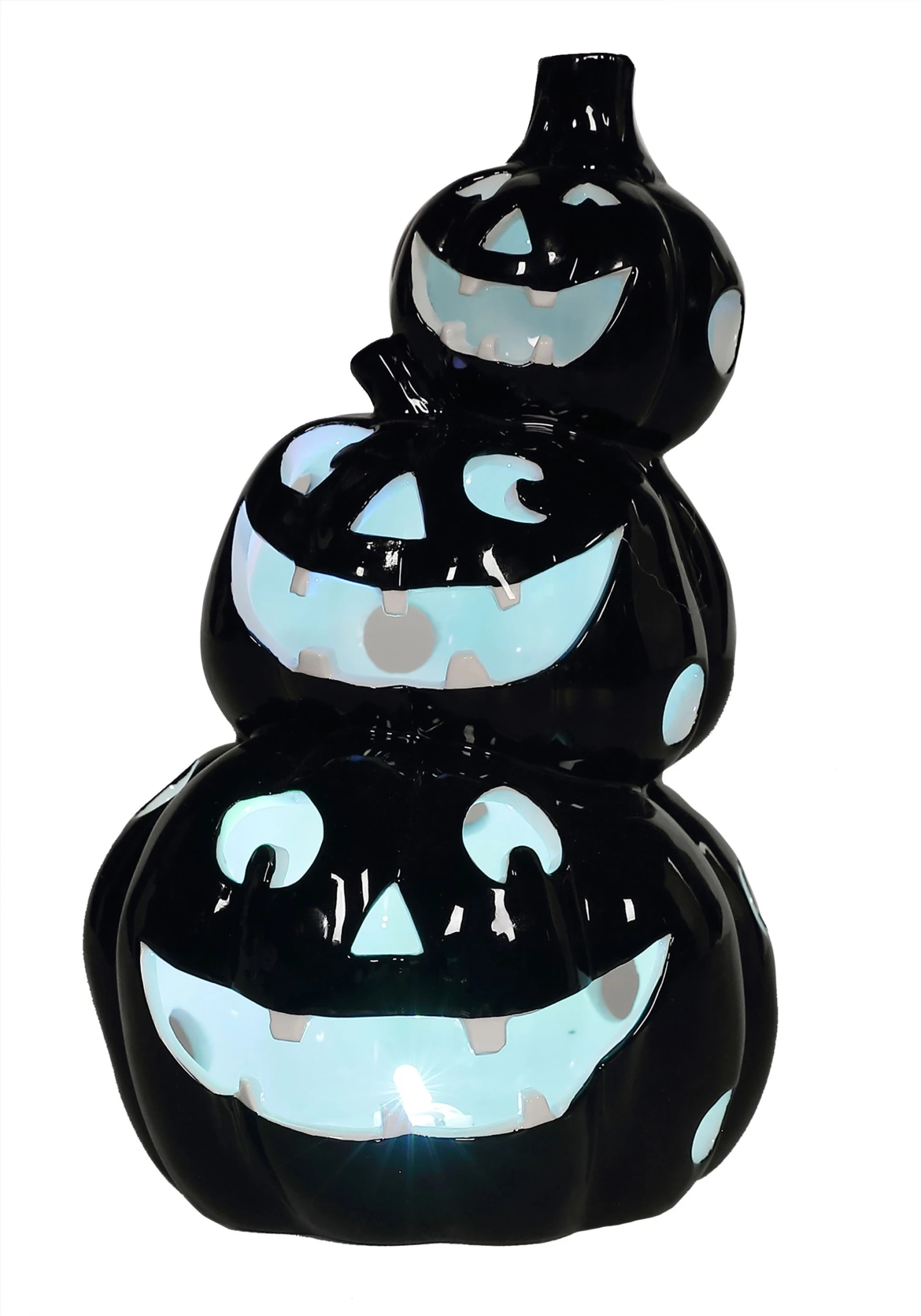 Give your jack-o-lanterns a makeover for Halloween with this Ceramic Black and White 3-Pumpkin Glow Stack. This cheerful decoration is designed to look like 3 grinning gourds stacked on top of each other. Instead of a bright orange exterior though, these happy characters are painted inky black.