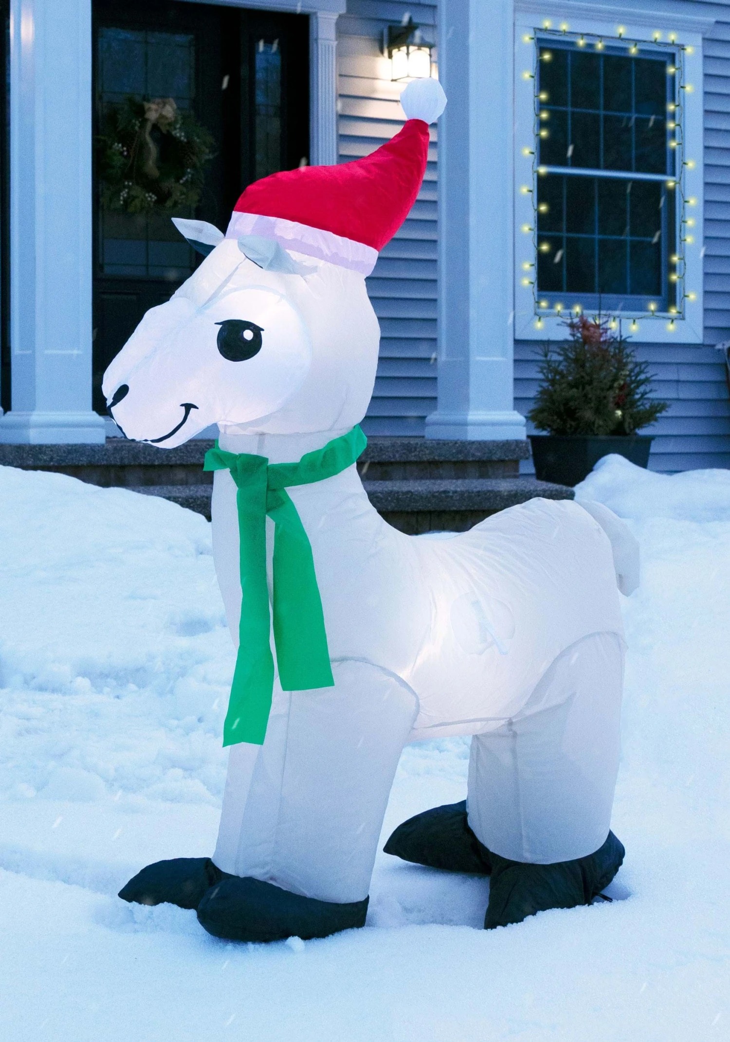 Have the cutest and most original decoration on the block thanks to this exclusive 4 Foot Inflatable Alpaca Decoration! Made of sturdy polyester, the piece is designed to look like a smiling white alpaca wearing a Santa hat and a green scarf. It comes with an attached fan to keep it fully inflated as long as it’s plugged into an outlet.