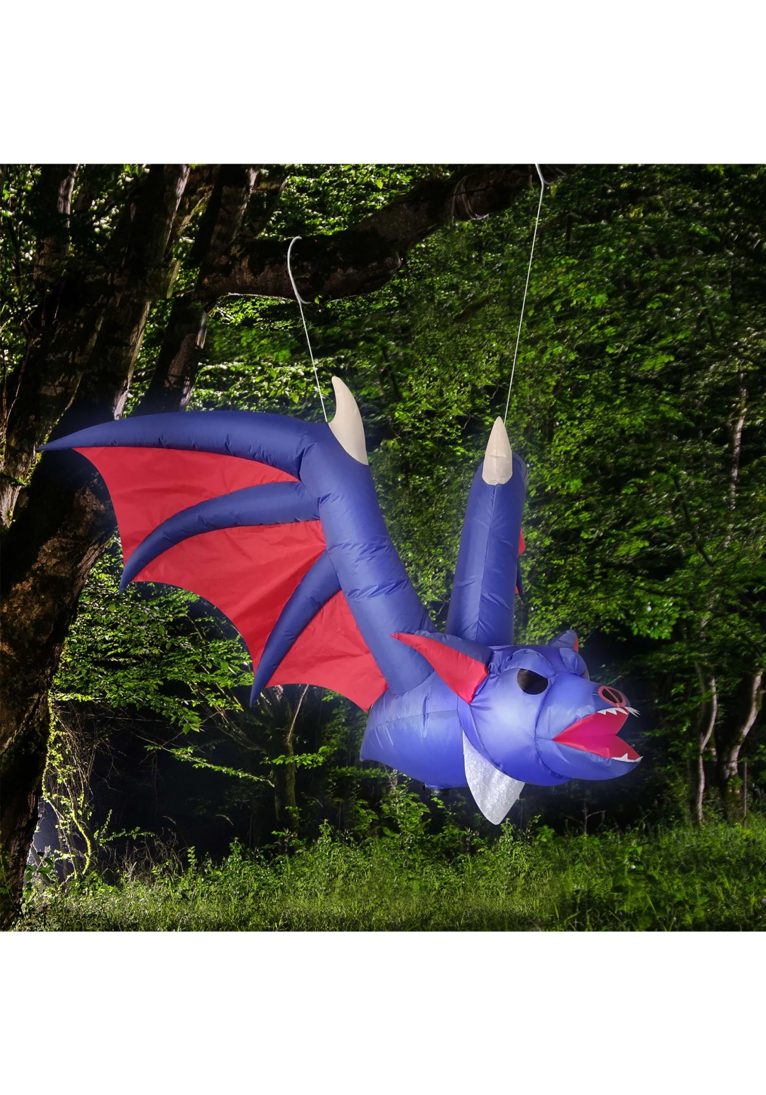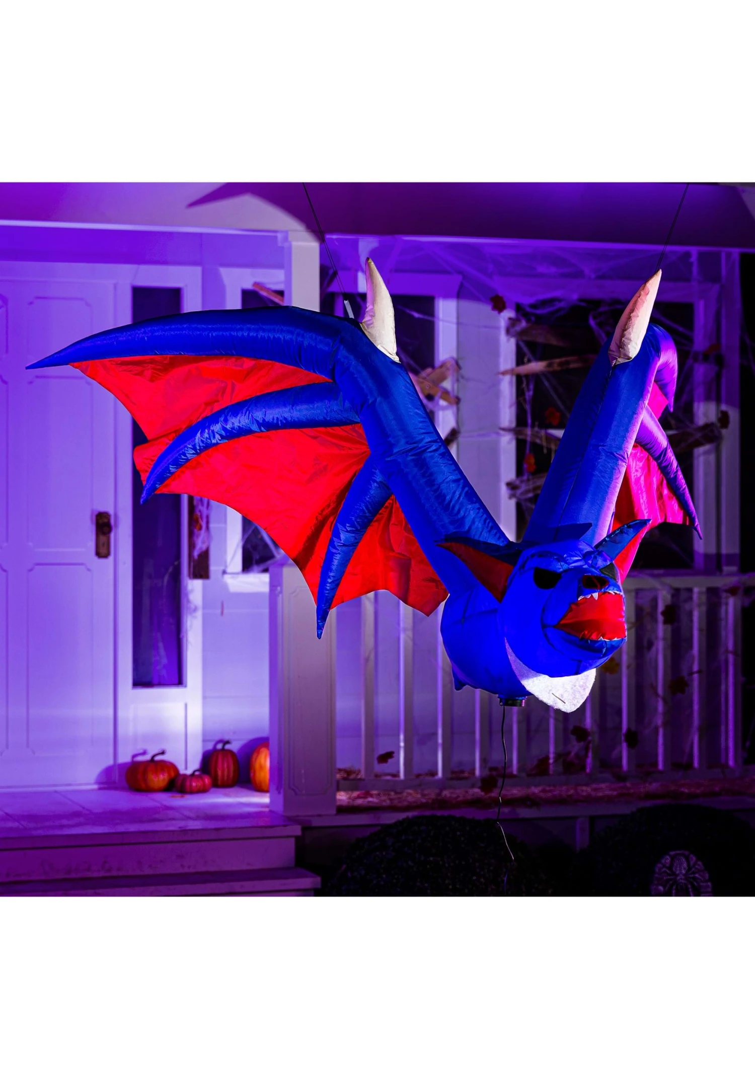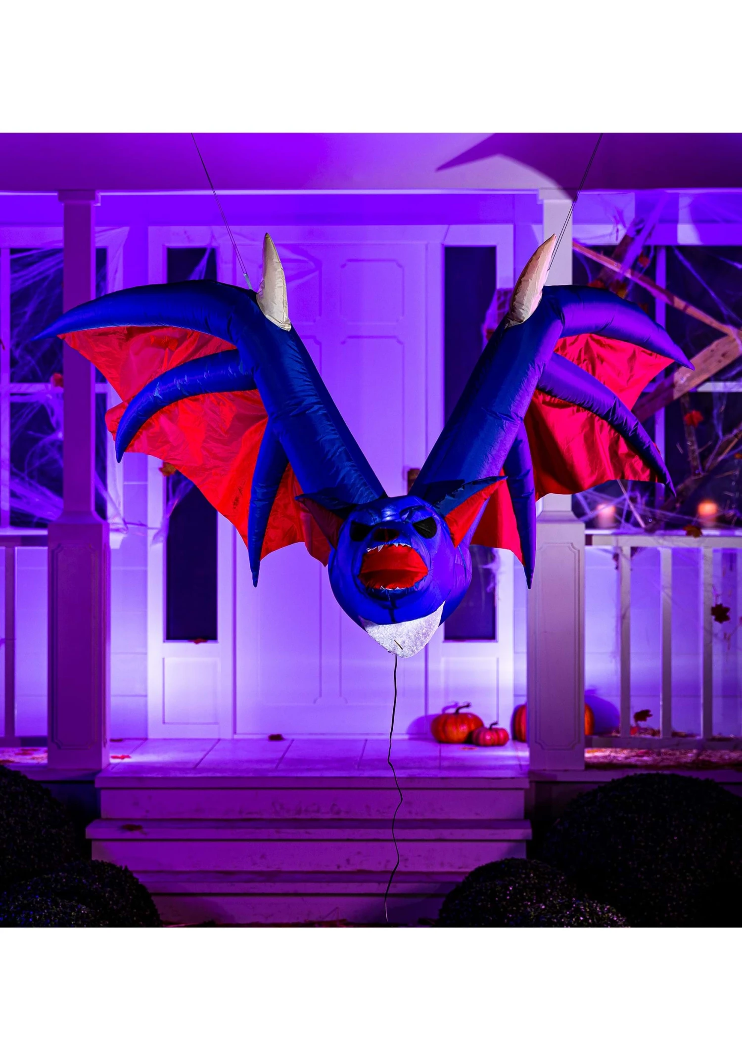 Frighten your friends with a 4FT Tall Hanging Bat Inflatable Decoration! When fully inflated, the decoration resembles an enormous blue bat with outspread red wings. The mouth features white fangs, while the wings are tipped with white spikes. Use the attached cords to hang it from a sturdy support.Â