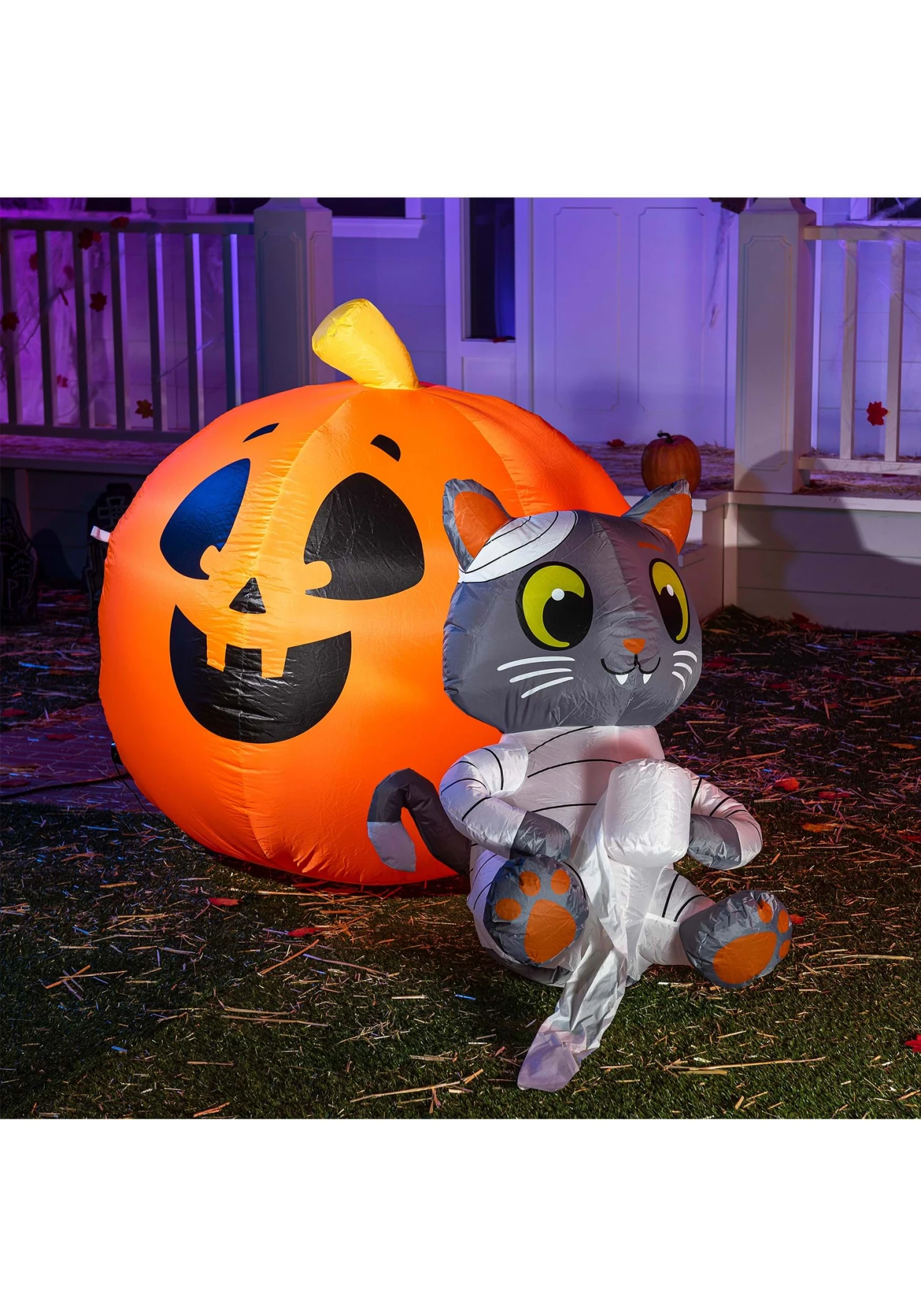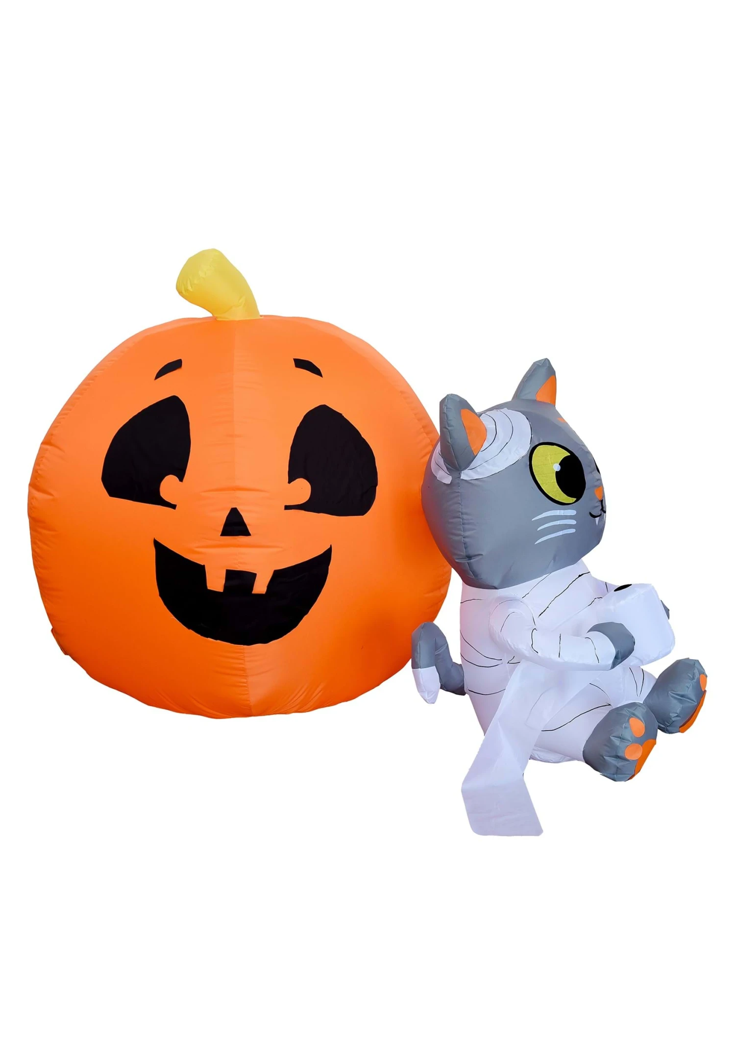 Made with windbreaker fabric, the Mummy Cat and Pumpkin Inflatable Decoration has a sturdy construction ready to brave October winds. Printed details ensure the dynamic duo’s smiles shine bright all season long. Meanwhile, included ground stakes and tether cords that tie to loops on the decoration help keep kitty and pumpkin anchored in place.