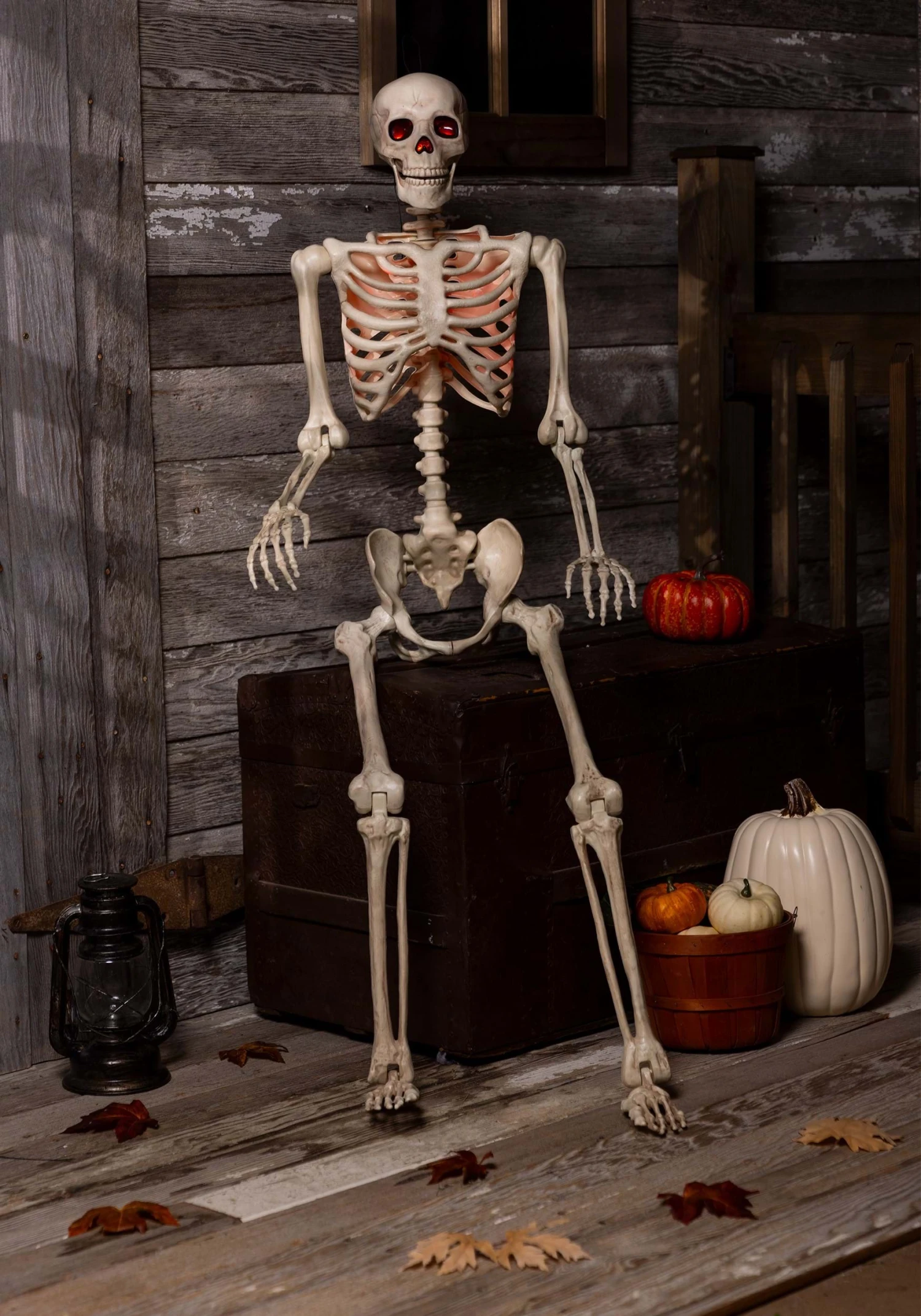 Set a scary scene using this 5FT Poseable Skeleton Decoration with Red Light Up Face & Chest! The realistic skeleton is made of molded plastic with racheted arm and leg joints that can hold a pose. When activated, its eye sockets and chest compartment glow red. A cord loop is attached to the top of the skull for hanging purposes.Â