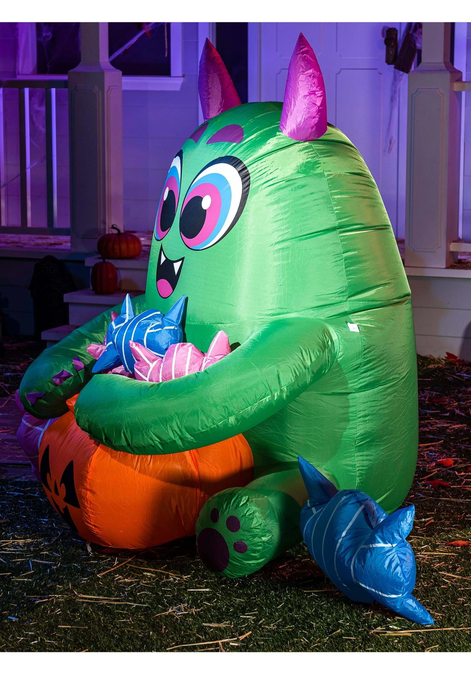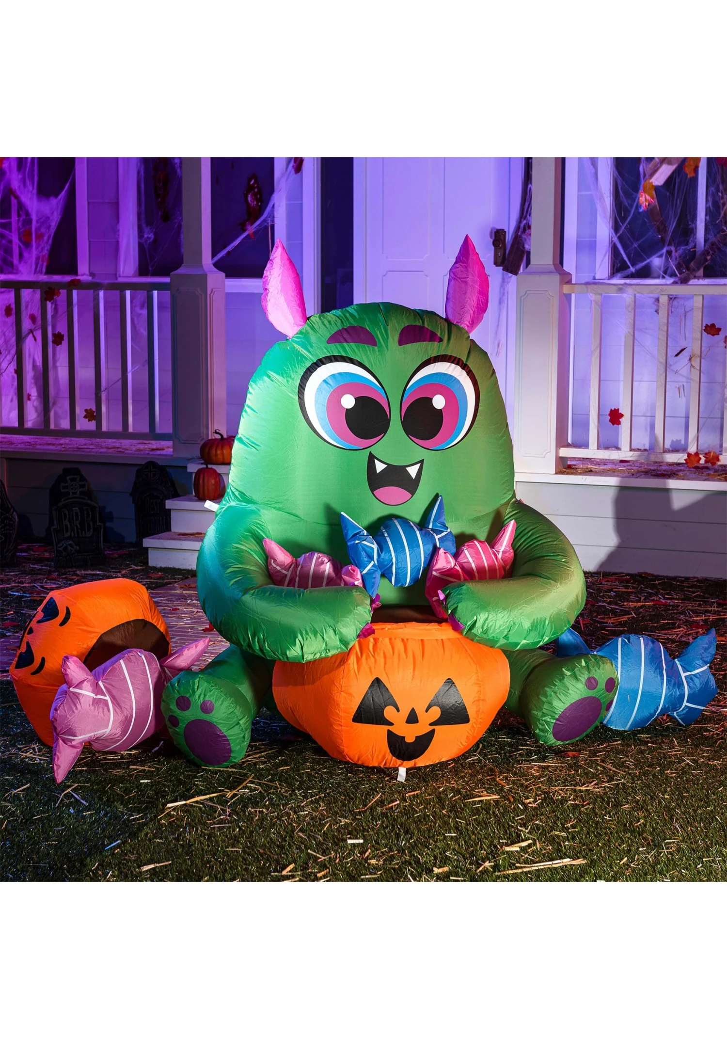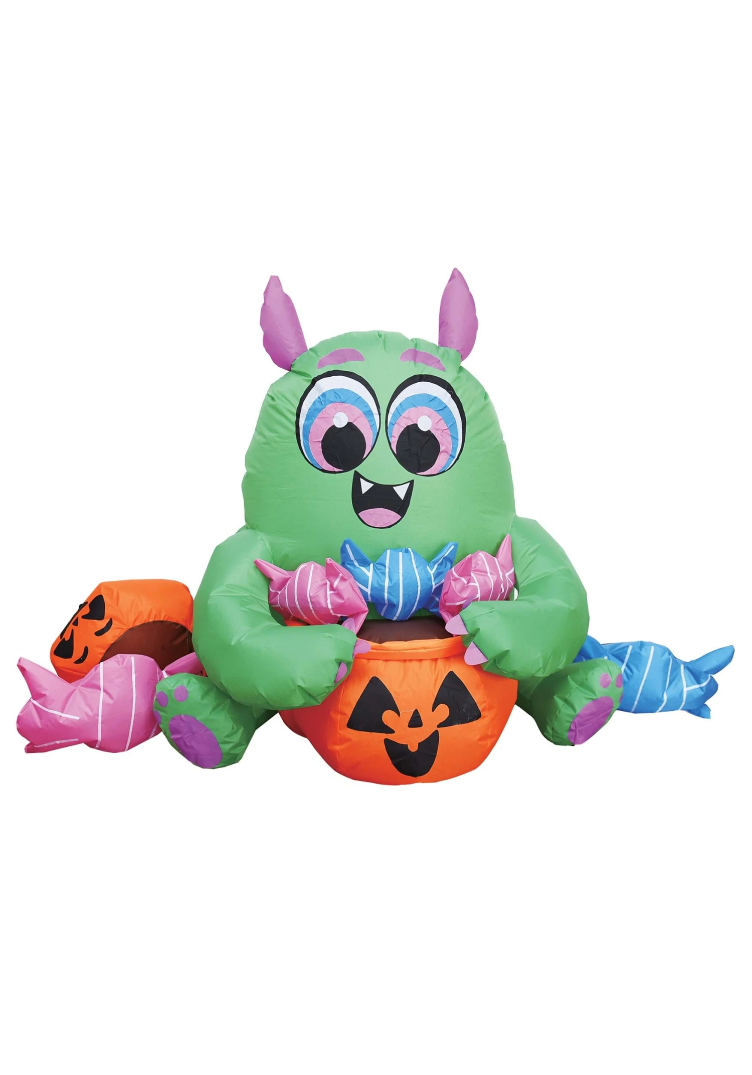 This 5ft Tall Candy Monster Inflatable Decoration will make your Halloween even sweeter! When fully inflated, it resembles an adorable green monster sitting behind a smiling jack o’ lantern and holding an armful of oversized candies. More candies are strewn beside it.Â