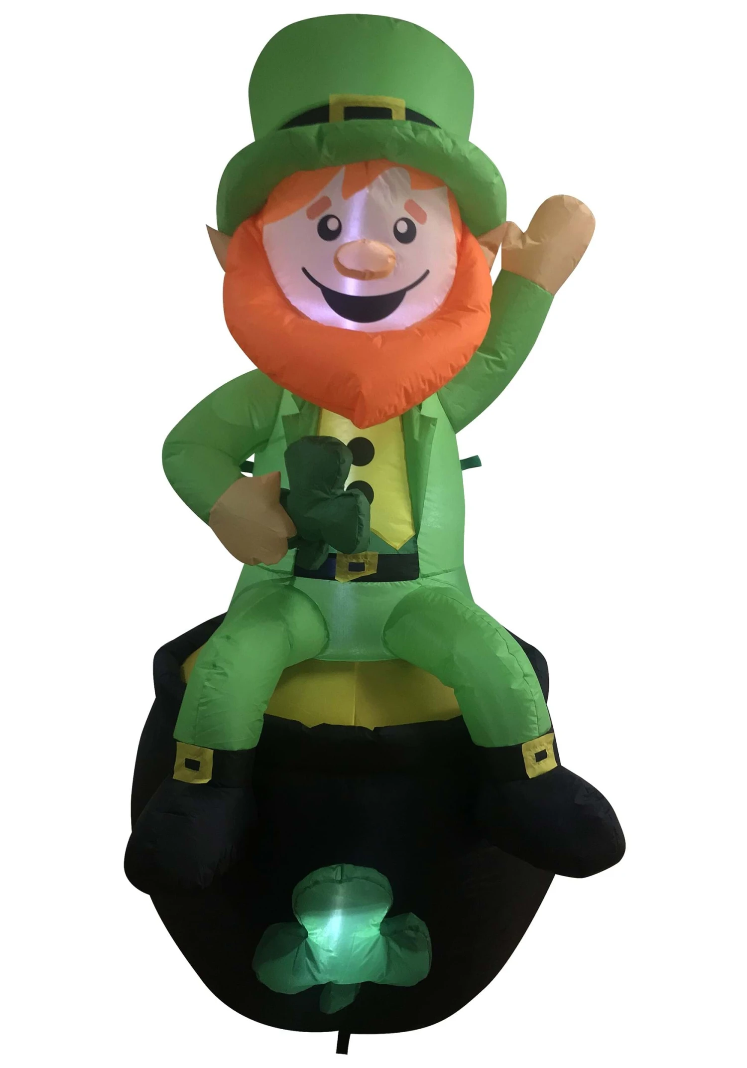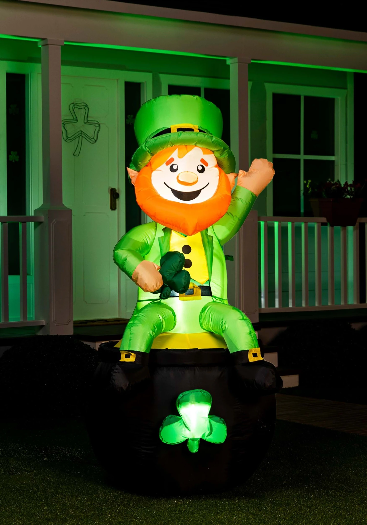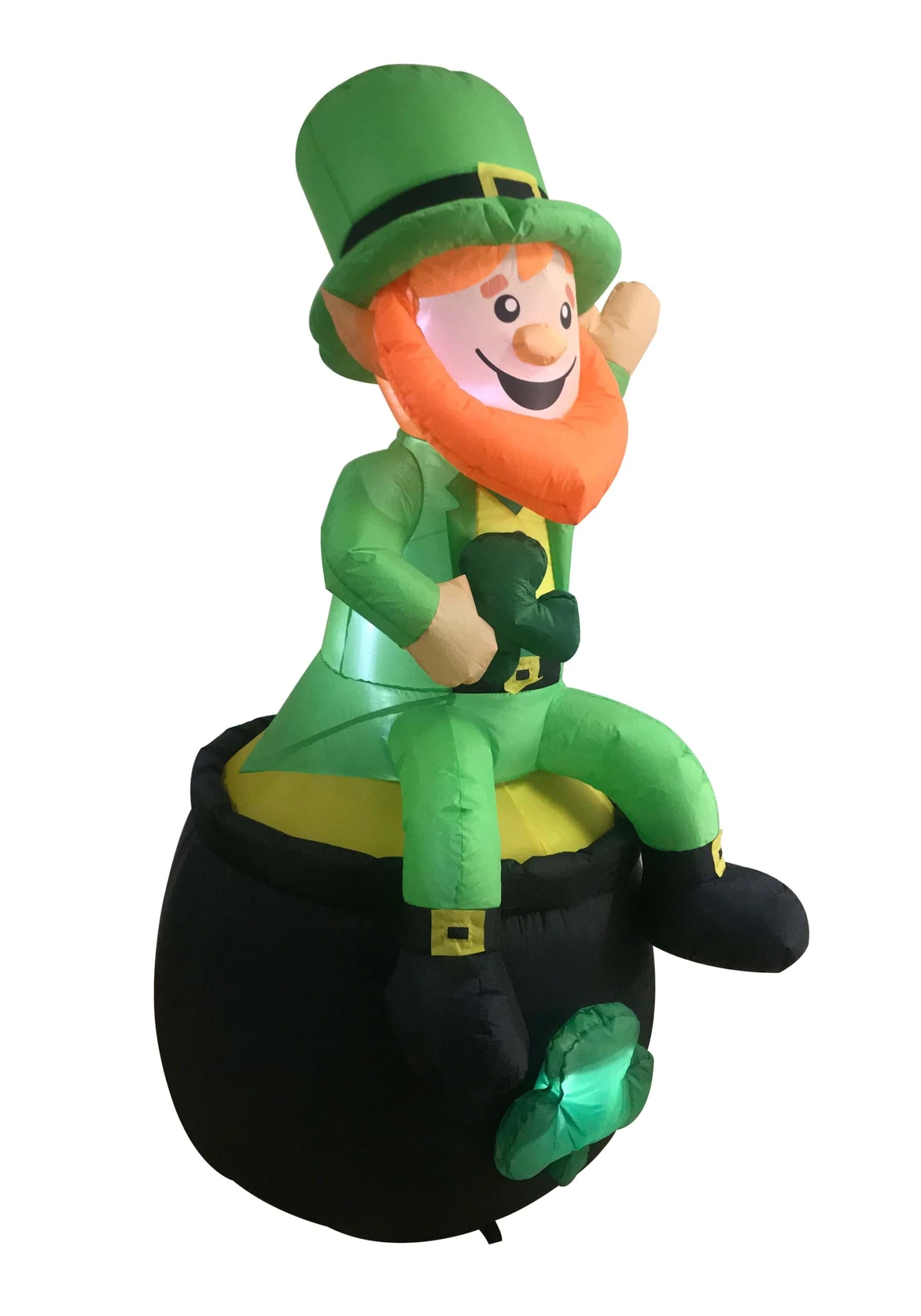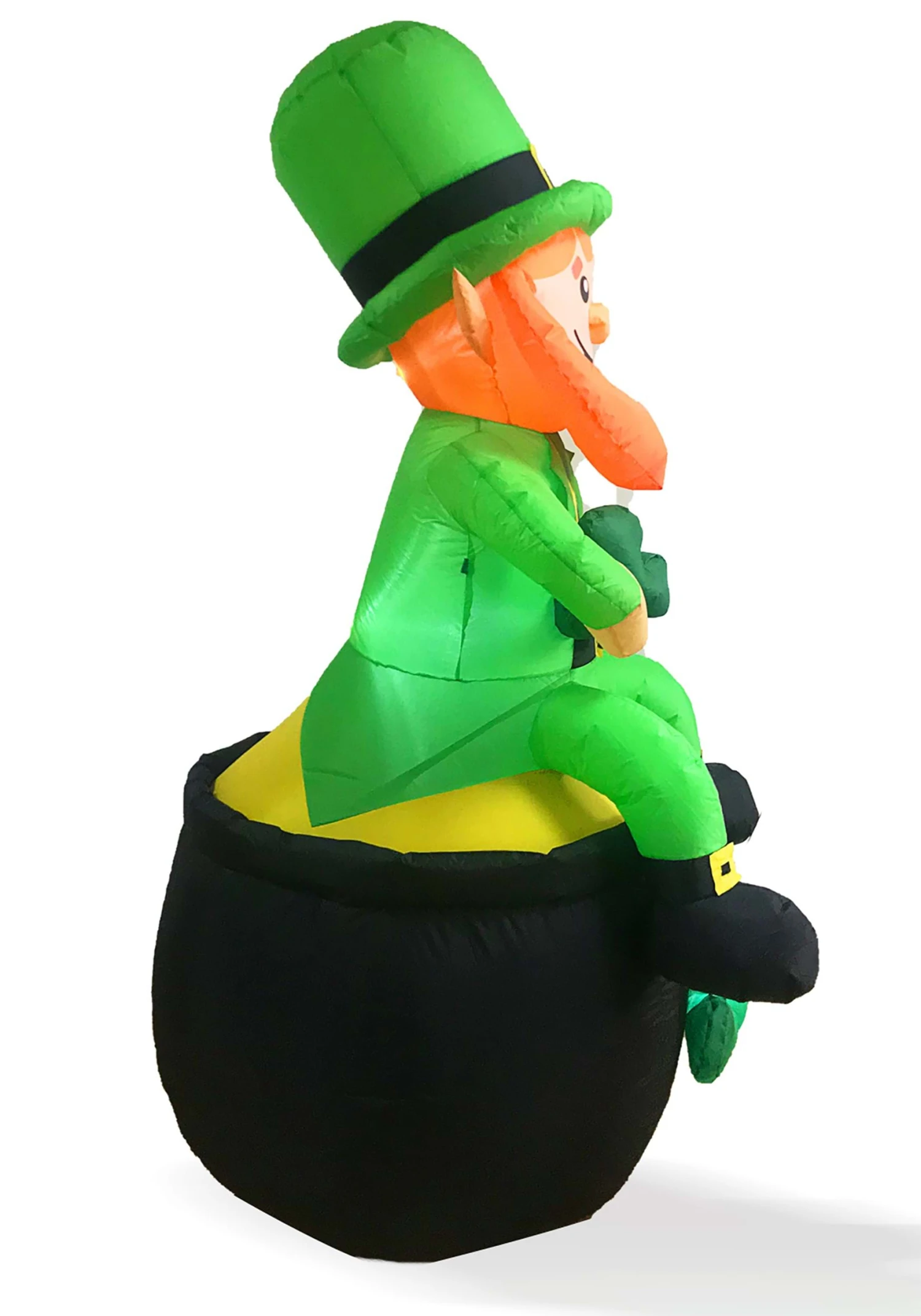 With this five-foot-tall inflatable, leprechauns are bigger than ever before! The light weight yard Saint Patrick’s Day decoration is easy to set up. Simply plug it in, turn it on, and watch it grow… and glow! A cheery green light glows from underneath the pot of gold, making this an easy sign of cheer to spot both day and night.Â