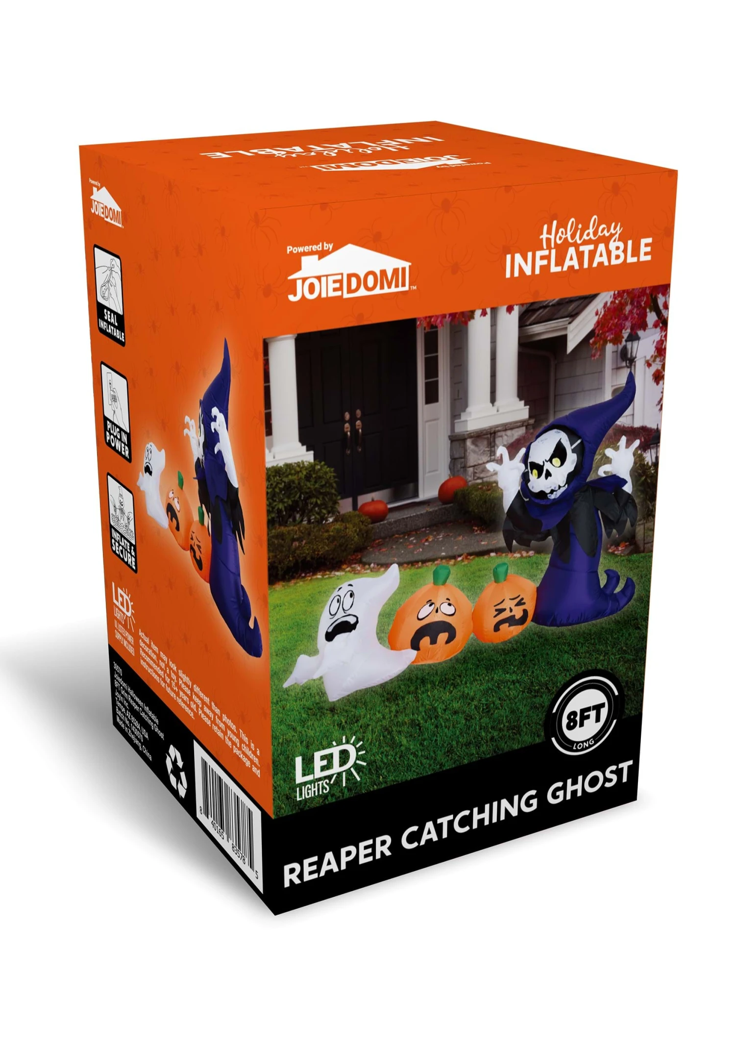Grab this 6 Foot Tall Large Reaper Catching Ghost Inflatable Decoration before it gets away! When fully inflated, the one-piece decoration looks like a wide-eyed ghost and two frightened jack-o-lanterns racing to get away from a hooded Grim Reaper. The Reaper has raised arms and a printed skull for a face.Â