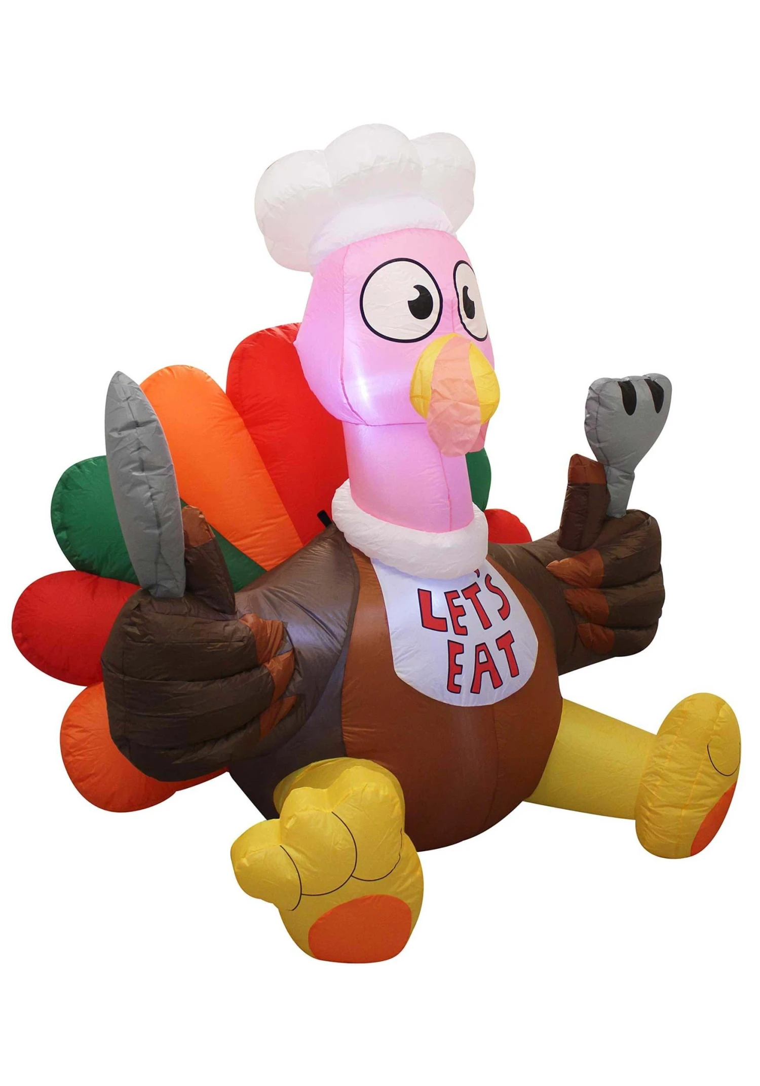 This gobbler stands 6 feet tall and features a seated turkey with a fork in one hand and a knife in the other. The words “Let’s Eat” are printed on the turkey’s bib, while its colorful tail fans out behind it. This is a piece you can deflate at the end of the holiday and use it year after year. So you’d better grab it while you can!