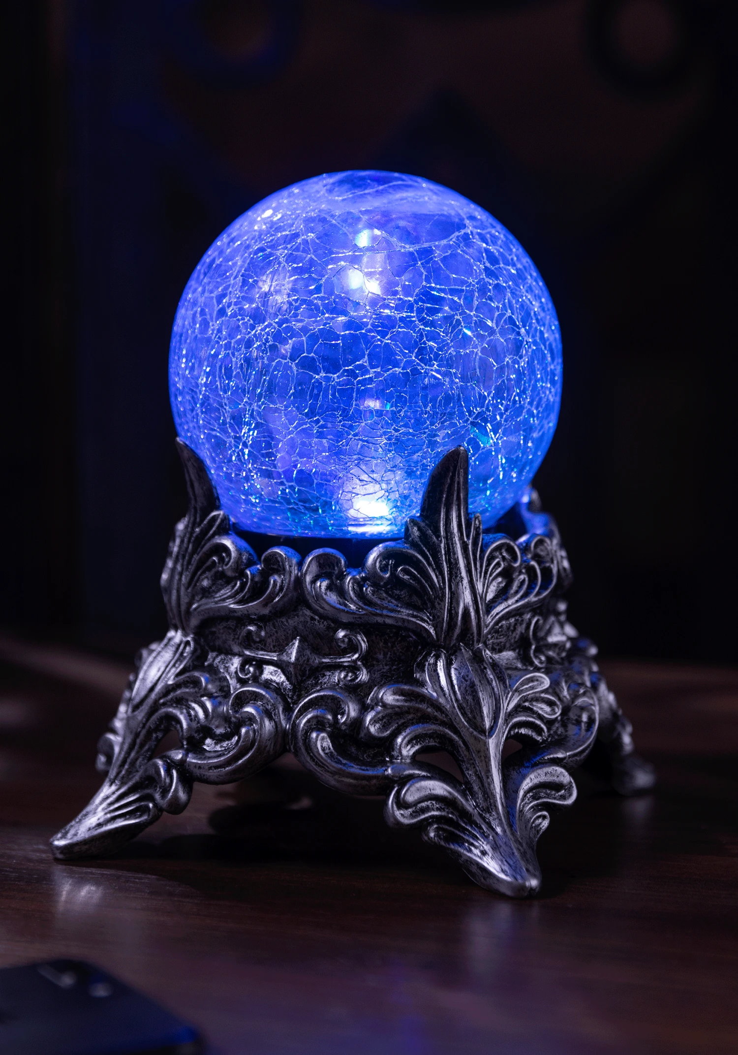 This Crystal Ball sits on a five-inch base with an antique silver base. The ball glows and changes color for extra magic flair when switched on. While demo batteries are included, keep your fortune-telling going by providing it with three AAA batteries.Â