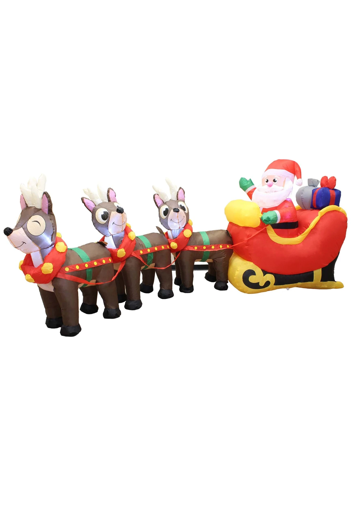 If you can’t sleep on Christmas Eve, make sure to find a comfortable seat by the window with a good view of the sky. You might be lucky enough to catch a glimpse of a magical sleigh being pulled past the stars by a team of flying reindeer. And if you don’t spot the real deal, you’ll love looking at this cute 9.5 Foot Tall Jumbo Reindeer & Santa Inflatable Decoration instead! The decoration depicts a waving Santa sitting in a sleigh full of presents and holding the reindeer’s reins.