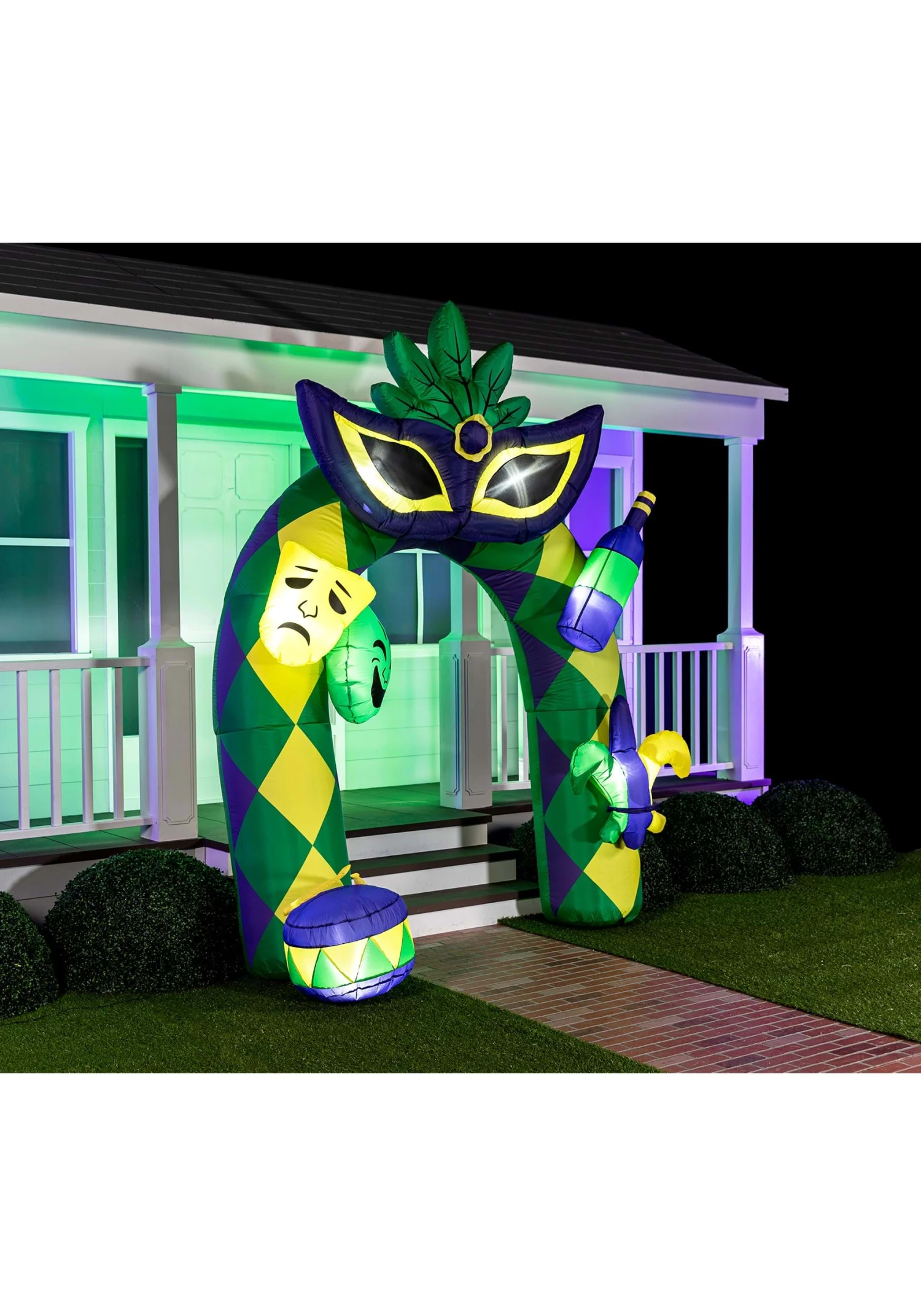 Are your friends in search of Fat Tuesday fun, complete with beads, king cake, costumes, and more? Show them where to find it with this 9.5ft Tall Mardi Gras Arch Inflatable Decoration! The blow-up decoration is made of sturdy, diamond-patterned material that holds its shape when inflated. It’s embellished with theater-style masks, a multicolored fleur de lis, and more. The crowning touch is the giant purple, yellow and green mask set at the top. Revelers will love entering your party through this festive and colorful arch!