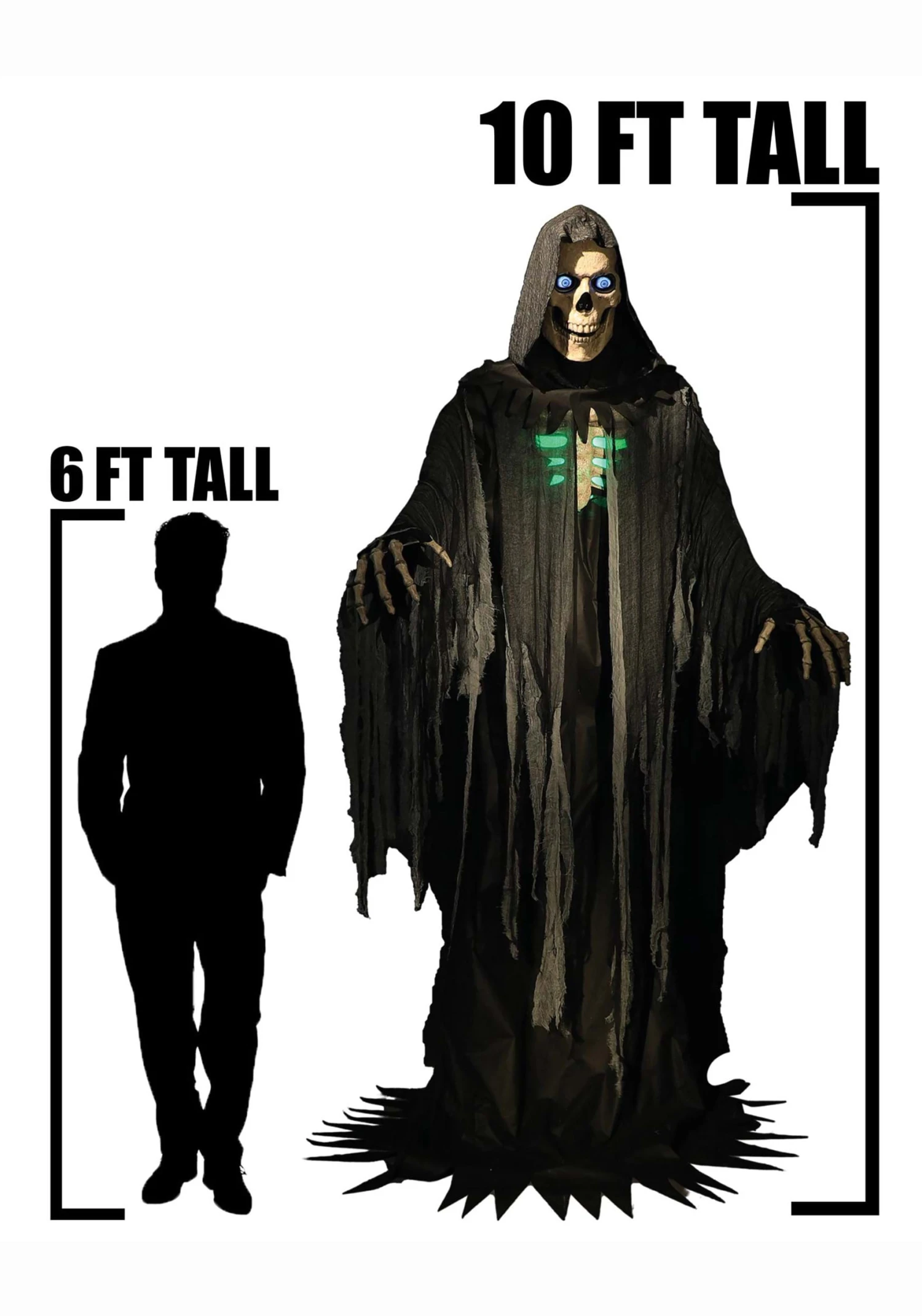 This Reaper figure will make a wonderful host for your Halloween display! He stands at an awesome 10 feet tall. Plug him in and his eyes will glow and blink. He moves his jaw and moves his head while repeating four different phrases that are on volume control to perfect it to your setting. Death has wide skeletal hands and a dramatic robe that flows around his eerie body. You can choose from three different activation modes: steady on, motion sensor, and the step here pad. Perfect for a wide variety of Halloween displays, the Reaper is sure to be a favorite prop for many Halloweens to come!