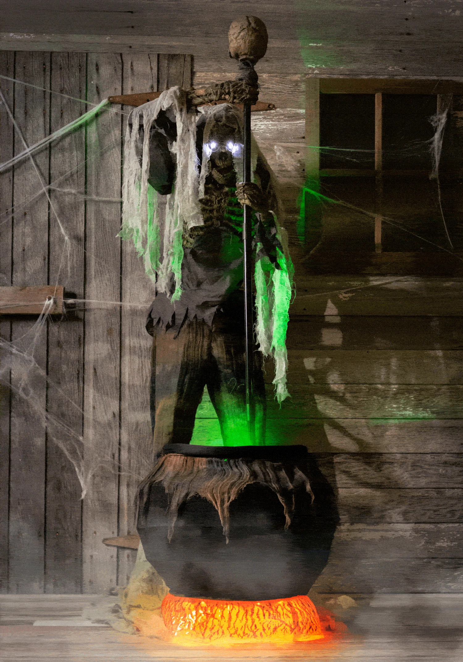 This stirring skeleton stands at a whopping six feet tall! The creature is disturbingly detailed. Wrinkled flesh clings to his bones while gauze hangs from his head and arms like a rotted shroud. He stirs a pot with a stick topped with an ancient skull. Visitors to your home are sure to love the light-up eyes, the glowing fire underneath the cauldron, and the three eerie sayings that come from the creature’s nodding head.