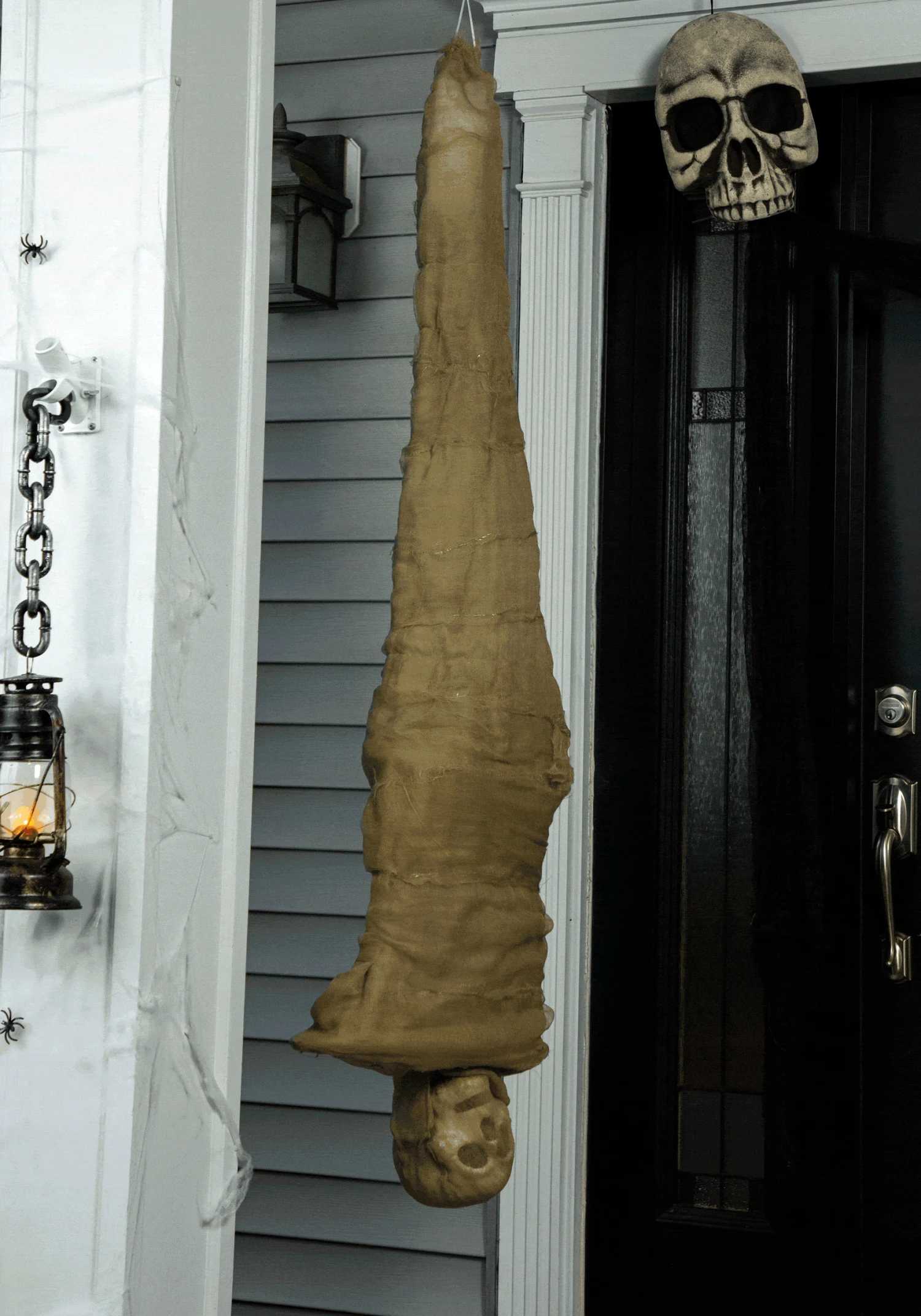 This exclusive Animated Mummy Halloween Decoration is sure to be a hit with trick-or-treaters! The mummy-gauze-wrapped body and the shrouded skeletal head look chillingly real. Hang him from a sturdy support and watch him startle the daylights out of visitors with his unexpected movements and sound effects.Â