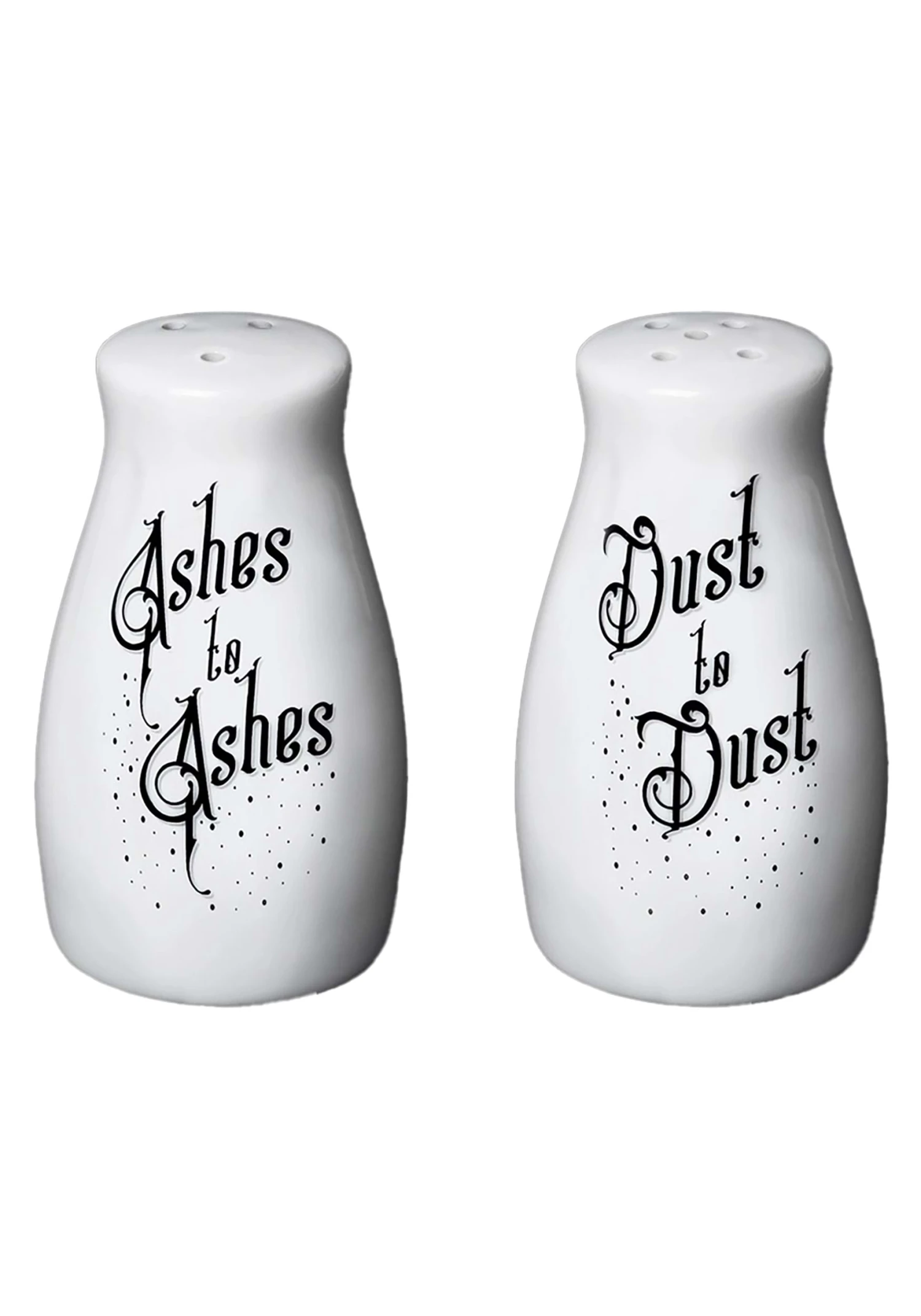 Prepare for another season of subtle spookiness with this set of Ashes to Ashes & Dust to Dust Salt and Pepper Shakers. The classically shaped, white ceramic condiment dispensers stand 3.25-inches tall with a sturdy base measuring 2-inches in diameter. A flexible plastic plug makes filling, emptying, and cleaning the shakers easier. Meanwhile, if you’re debating which number of holes means salt and which means pepper, the black print text can help! Fill ash to ash with pepper for a peculiar nod to the color and texture of actual ash and give dust to dust a sparkle like pixie dust with crystalline table salt. With these inconspicuous Halloween decorations on your table, dinner guests won’t know if they’re mixing up a witches’ brew or simply seasoning the veggies!