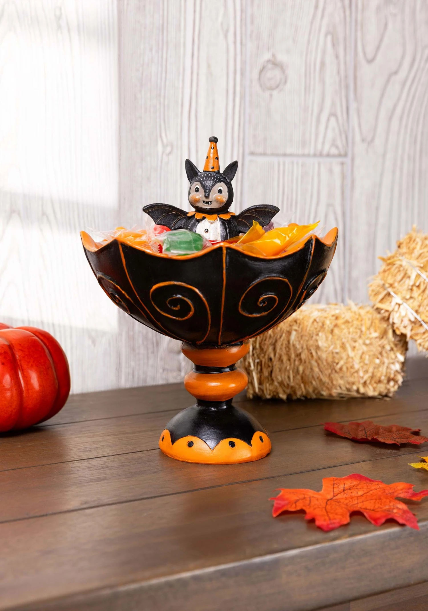 This Bat Treat Stand by Johanna Parker makes a charming place to display your Halloween candy, snacks, and more! The black and orange bowl is fancifully decorated and sits on a mini pedestal. A carved black bat wearing a cone-shaped hat and a scalloped ruff is attached to the center of the bowl.