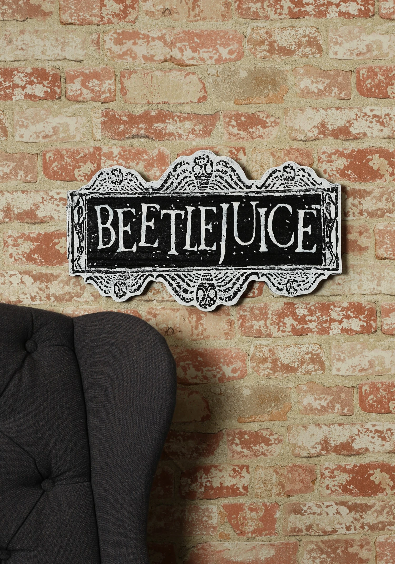 The Beetlejuice Sign is great for Halloween decor, or letting your friends know that Beetlejuice owns the place. The sign measures 18 inches, by 10 inches, by 1 inch. It is a detailed sign that will look great in any home. The Molded foam is painted to look like old weathered stone.