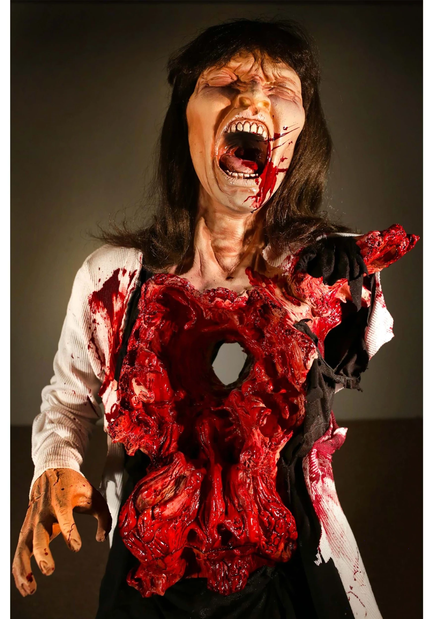 Our Heartless Prop is not for the faint-hearted. Constructed from a durable combination of latex, foam, and metal armature, this life-sized scare factor is engineered to send a chill down even the bravest of souls. The prop features a highly detailed, horrific depiction of a kneeling woman, characterized by a gruesomely gaping hole in her chest. As a true testament to its frighteningly lifelike appeal, it’s coated in realistic, blood-red detailing that’s sure to bring the nightmarish scene to life.