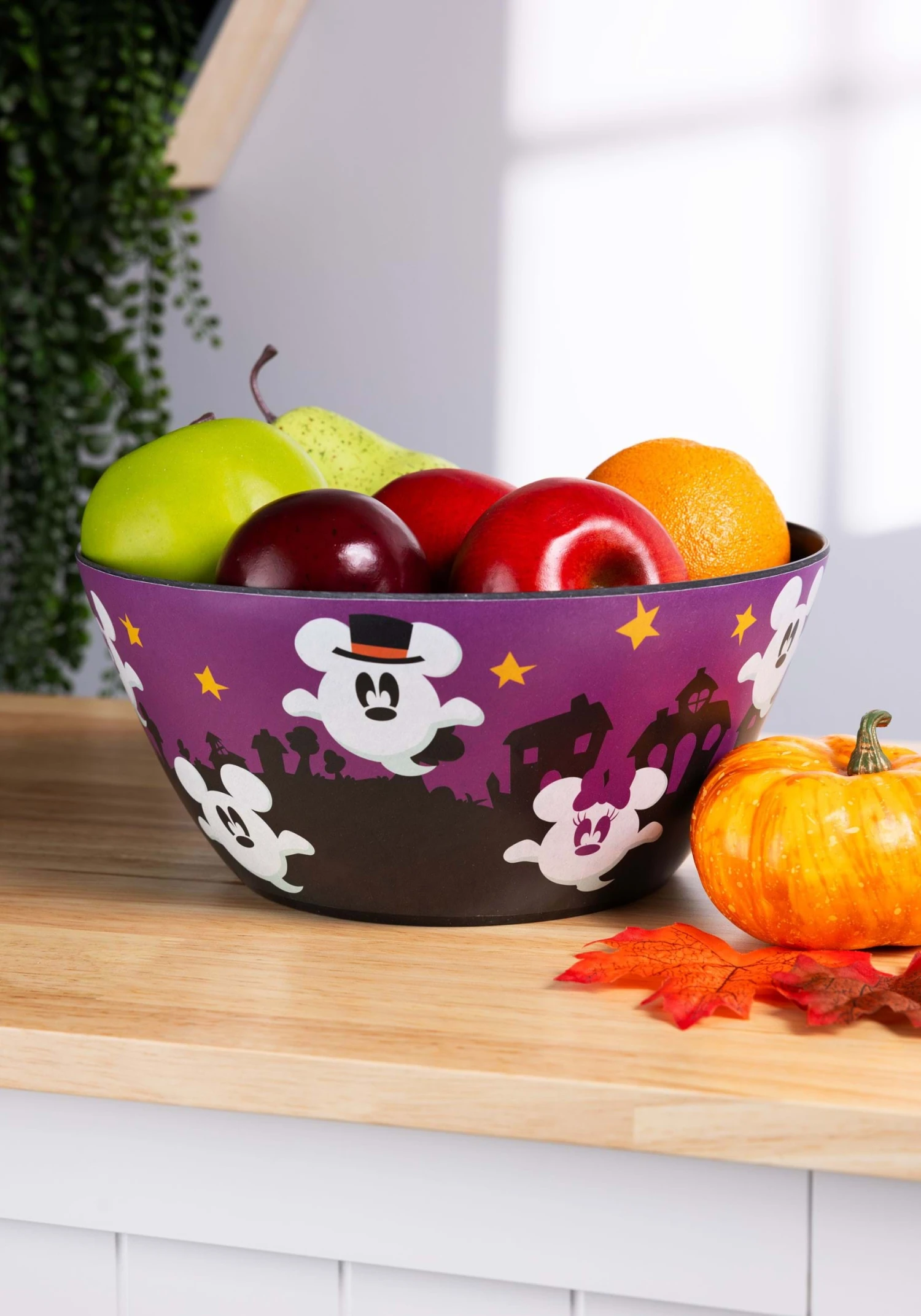 Serve up a spooky side in this officially licensed Disney Mickey Ghost Black Bamboo Tossed Salad Bowl! The purple bamboo bowl is decorated with silhouettes of haunted houses, orange stars, and cute ghosts that have top hats and Mickey Mouse ears. The inside of the bowl is solid black.Â