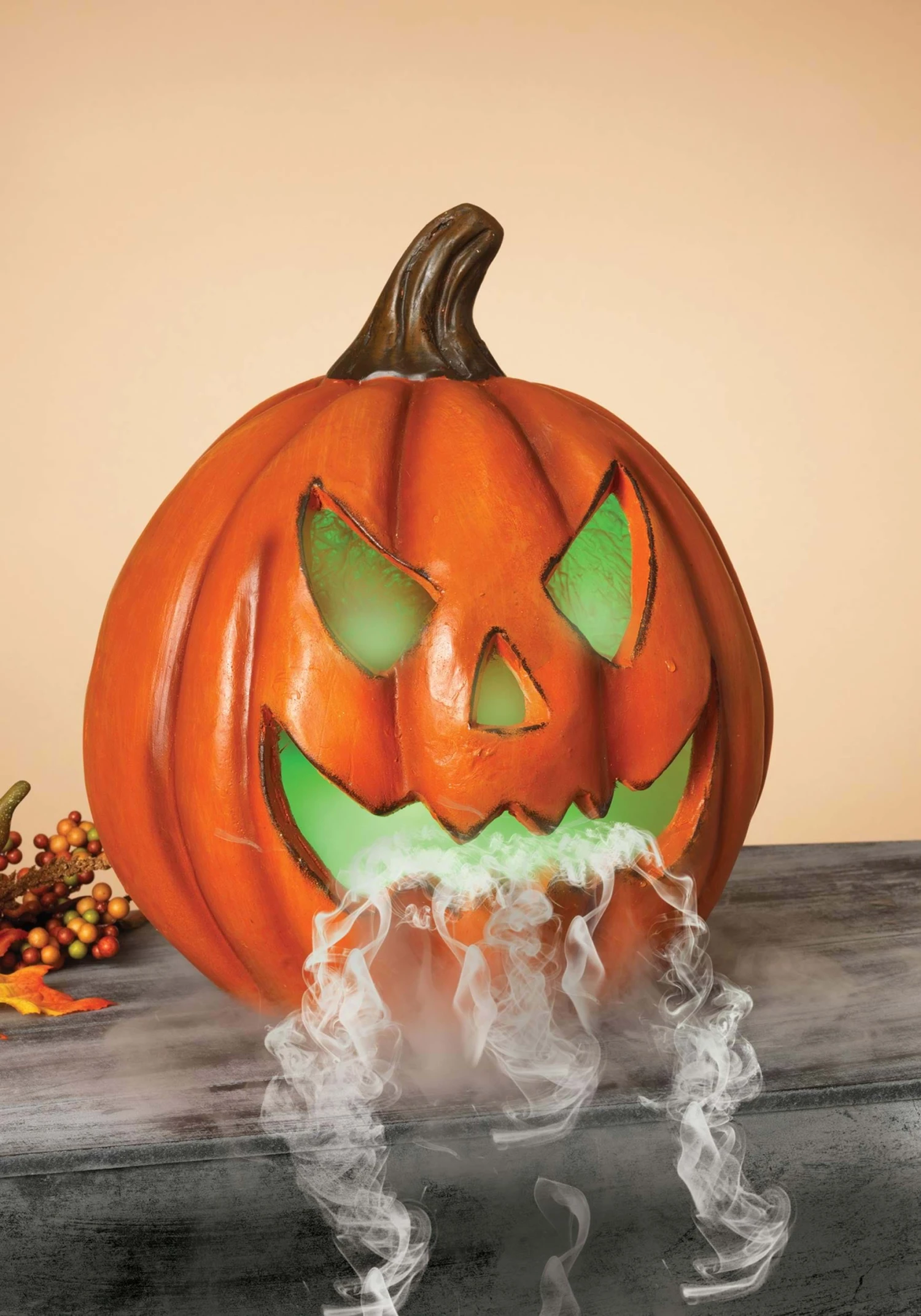 Have the coolest decoration on the block when you set out this Electric Lighted Smoking 14″ Pumpkin! Its mischievously slanting eyes and wicked smile hint that its not your average cutesy jack-o-lantern, and its spookiness becomes even more obvious when its inner green LED lights and smoke machine are running! It’s so creepy and amazing that visitors will be thoroughly impressed.Â