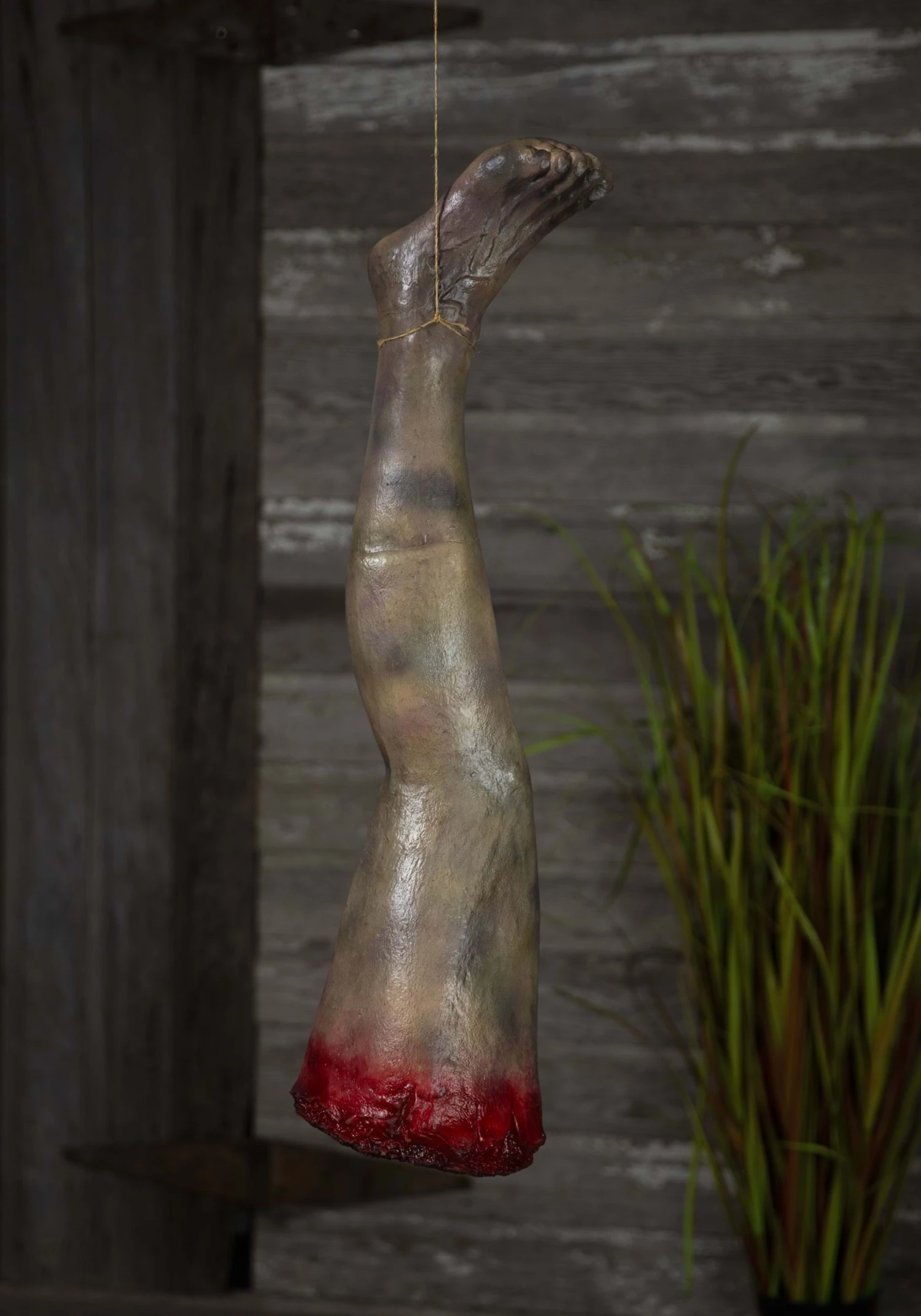 Add some gore to your decor with this Full Sized Deluxe Severed Leg Prop! The realistic-looking decoration resembles a life-sized human leg and foot. The top of the thigh is molded and painted to look as though it was hacked off of a body.