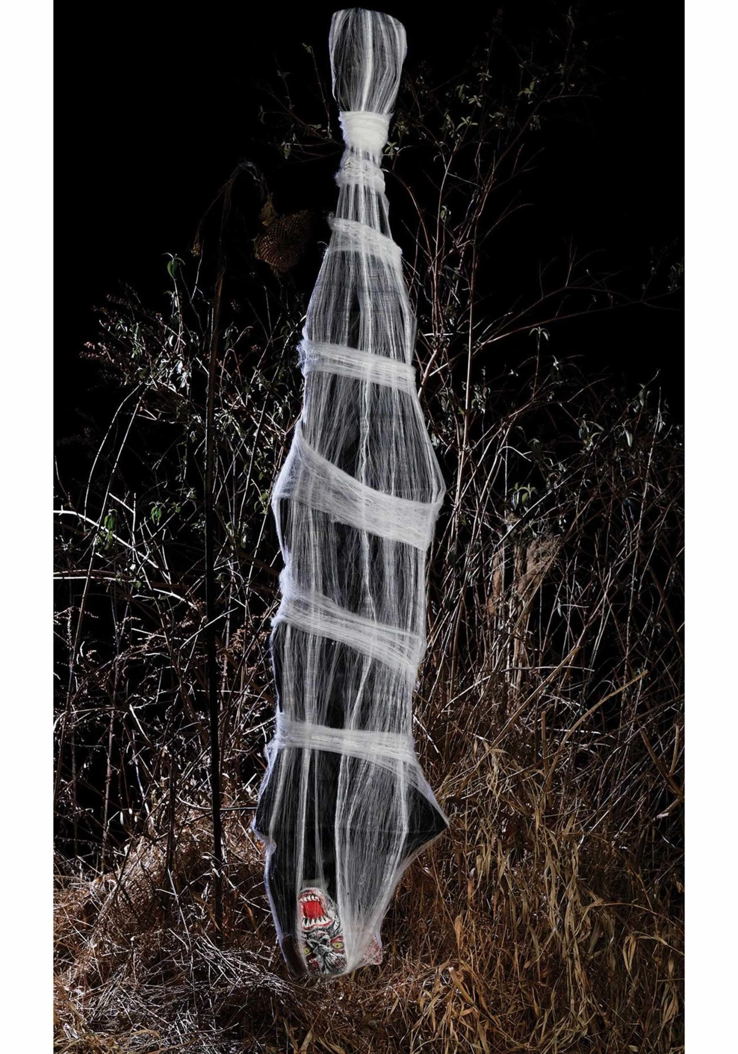 - Figure is draped w/ dark fabric & wrapped in wispy fibers that look like spiderwebs