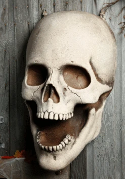 Serve up some supersized fun this Halloween with a Giant 30 Inch Super Skull Prop! The hand-painted decoration looks eerily realistic, with a flat back and two hanging rings. Flickering lights in its eye sockets give it a haunting appearance sure to spook and delight. Prop it up or hang it in a prominent place for some macabre fun!Â