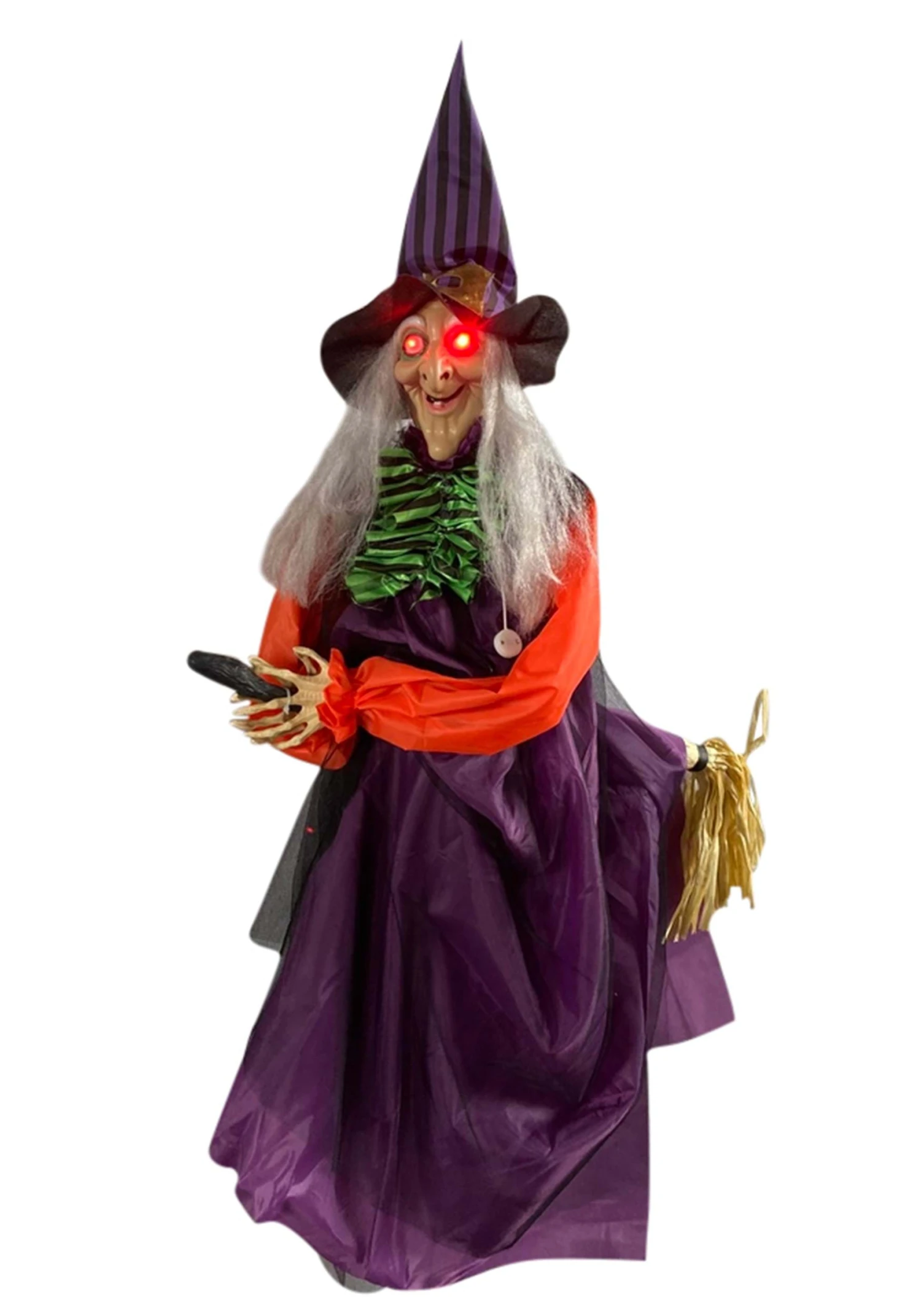 - When switch is turned on, witch’s eyes glow red, head moves from side to side, figure speaks various phrases, and broom moves up & down