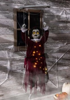 It’s all fun and games until this exclusive Haunted Swing Girlwith 20 Lights & Sounds Hanging Decoration starts to laugh! A small swing is suspended from a plastic bone, which features a hook at the top for hanging. Perched on the swing is a plastic doll with zombie-esque features and dark hair. She’s dressed in a tattered red gown. When turned on, the figure lights up and makes an evil cackling sound.Â