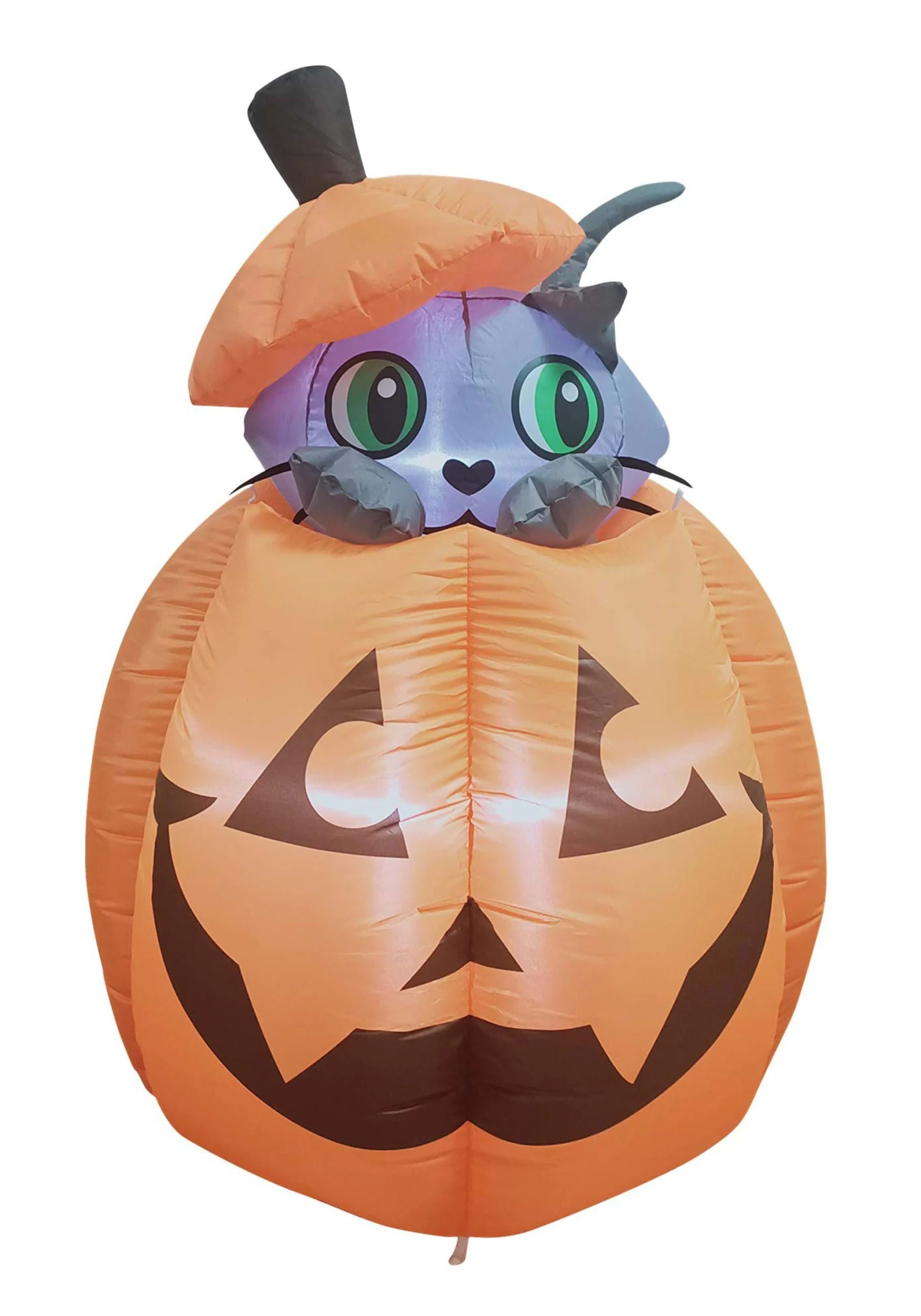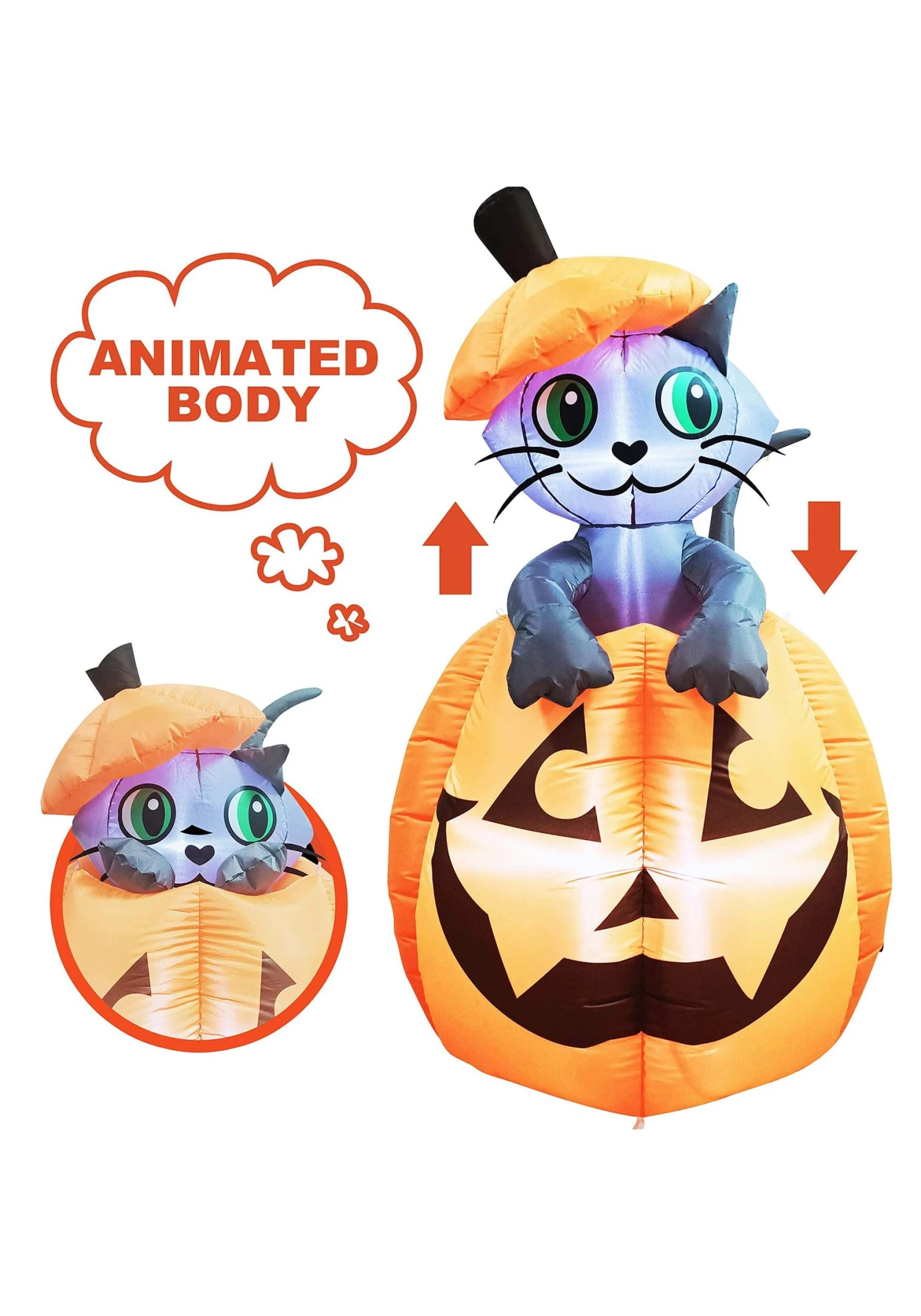 If you have a cat in your house then you know that life can be pretty unpredictable. Anyone who’s lived with a cat has been minding their own business only to be shocked by a giant crash in the kitchen. When you go to check it out, your cat greets you with a swishing tail and no trace of guilt at all! Cats are the reason for misplaced jewelry, spilled glasses of water, and middle of the night commotion. It’s safe to say that cats make life more interesting on a daily basis! Celebrate the chaos with this animated inflatable cat in pumpkin decoration!