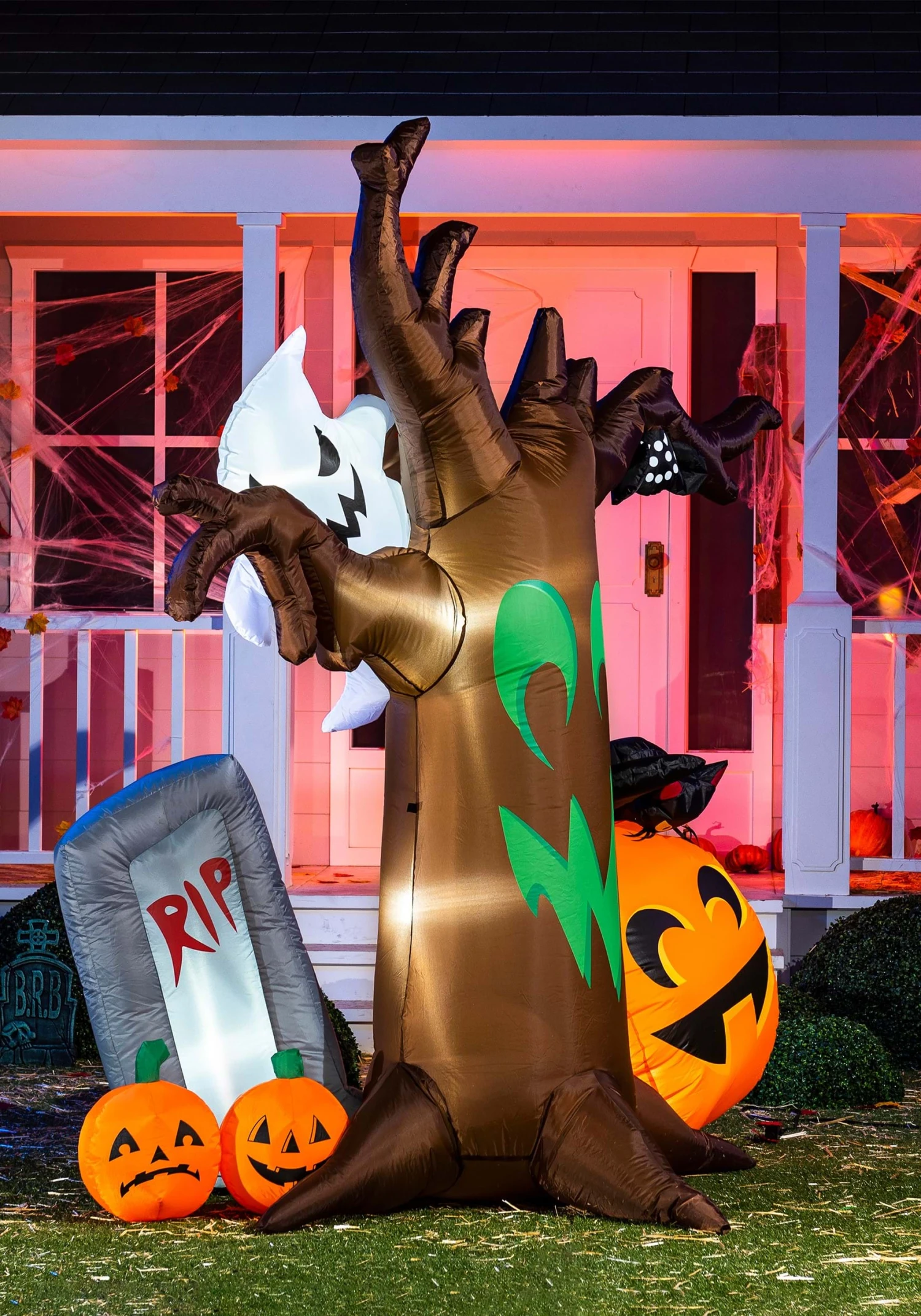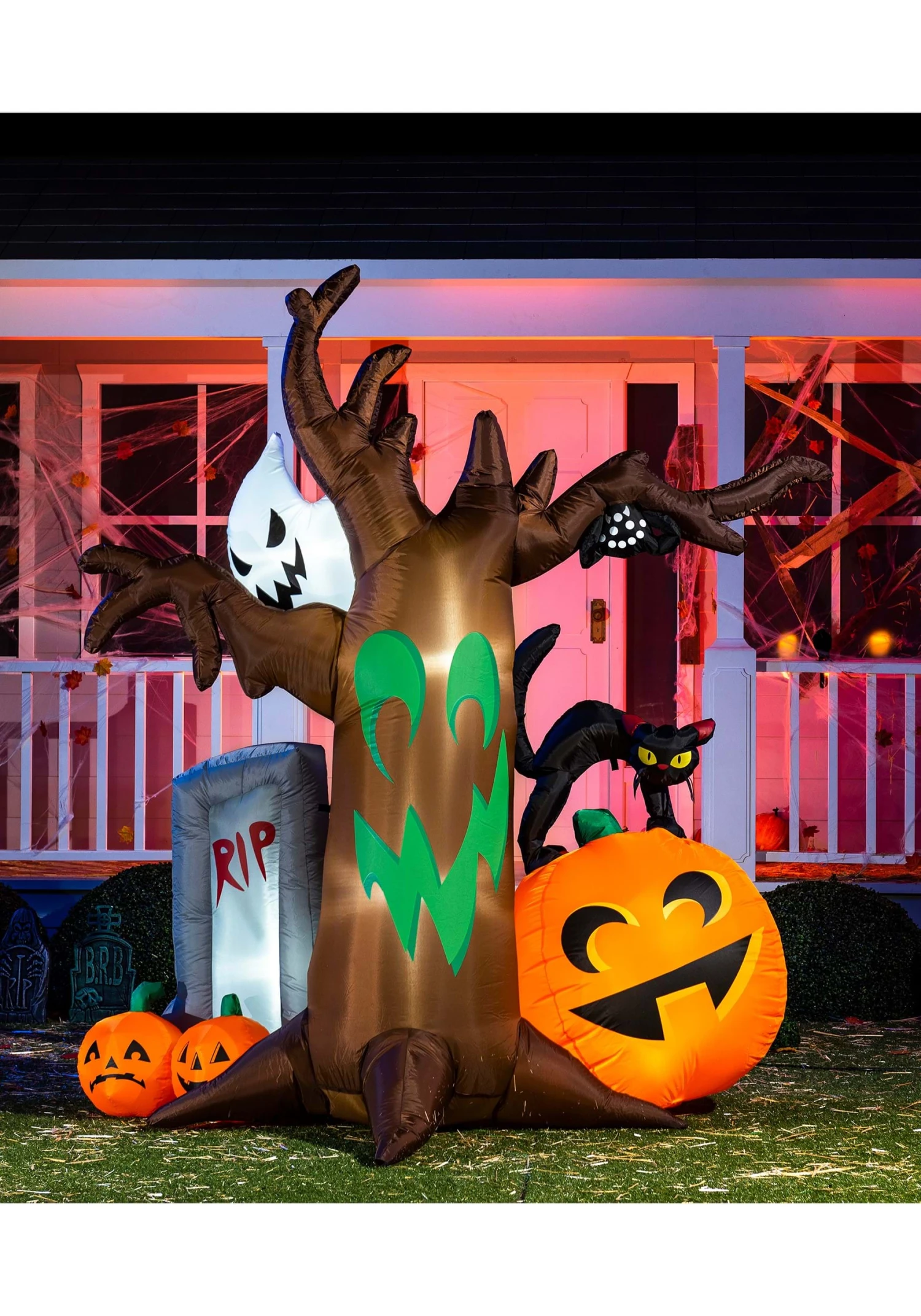 Give your front yard some spooky flair with an 8ft Tall Jumbo RIP Tree Inflatable Decoration! When fully blown up, the decoration includes a brown tree with a gren face, a peeking ghost, a bat, an arching cat, three jack o’ lanterns and a gray gravestone that reads “RIP.” Approach if you dare!Â
