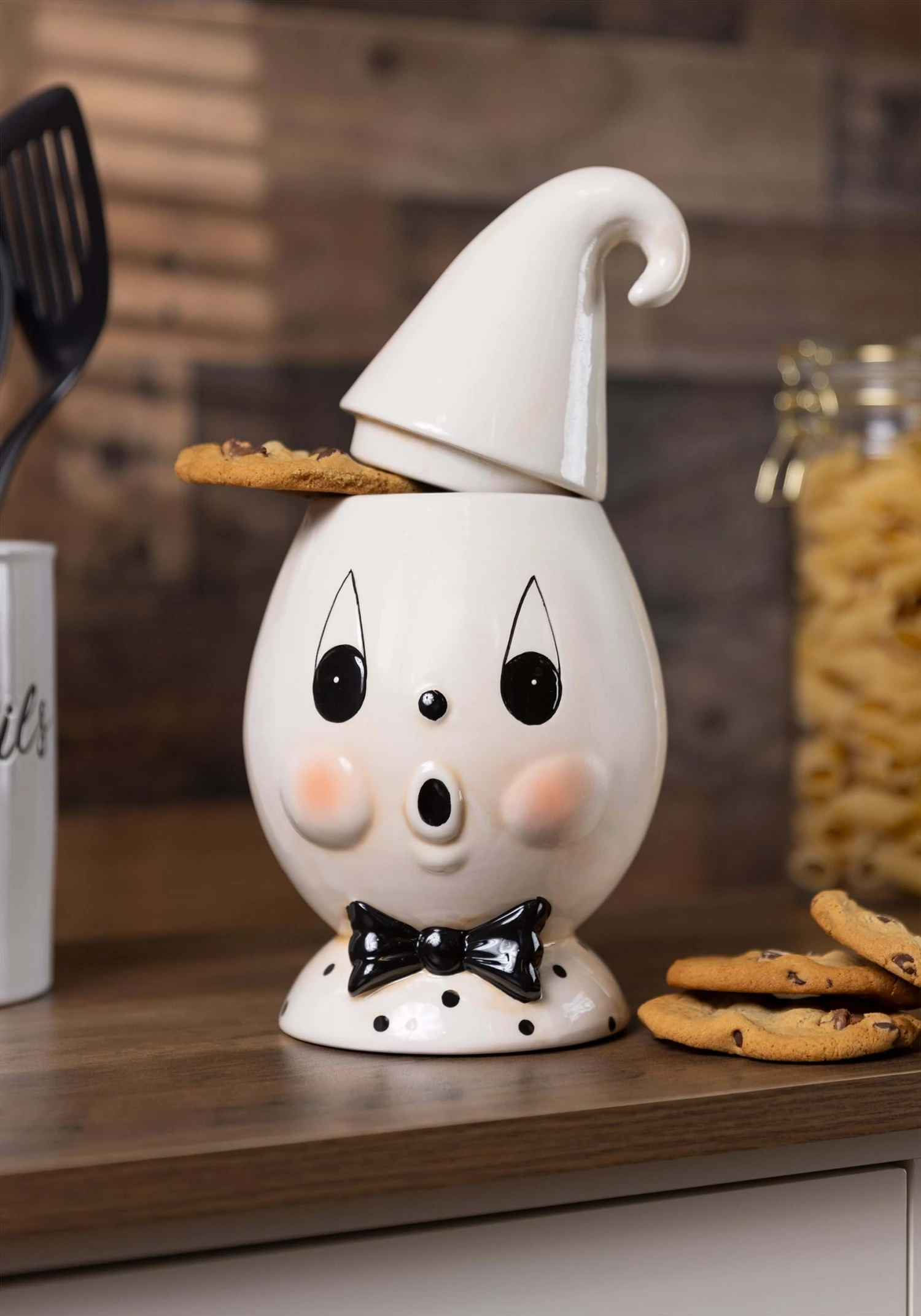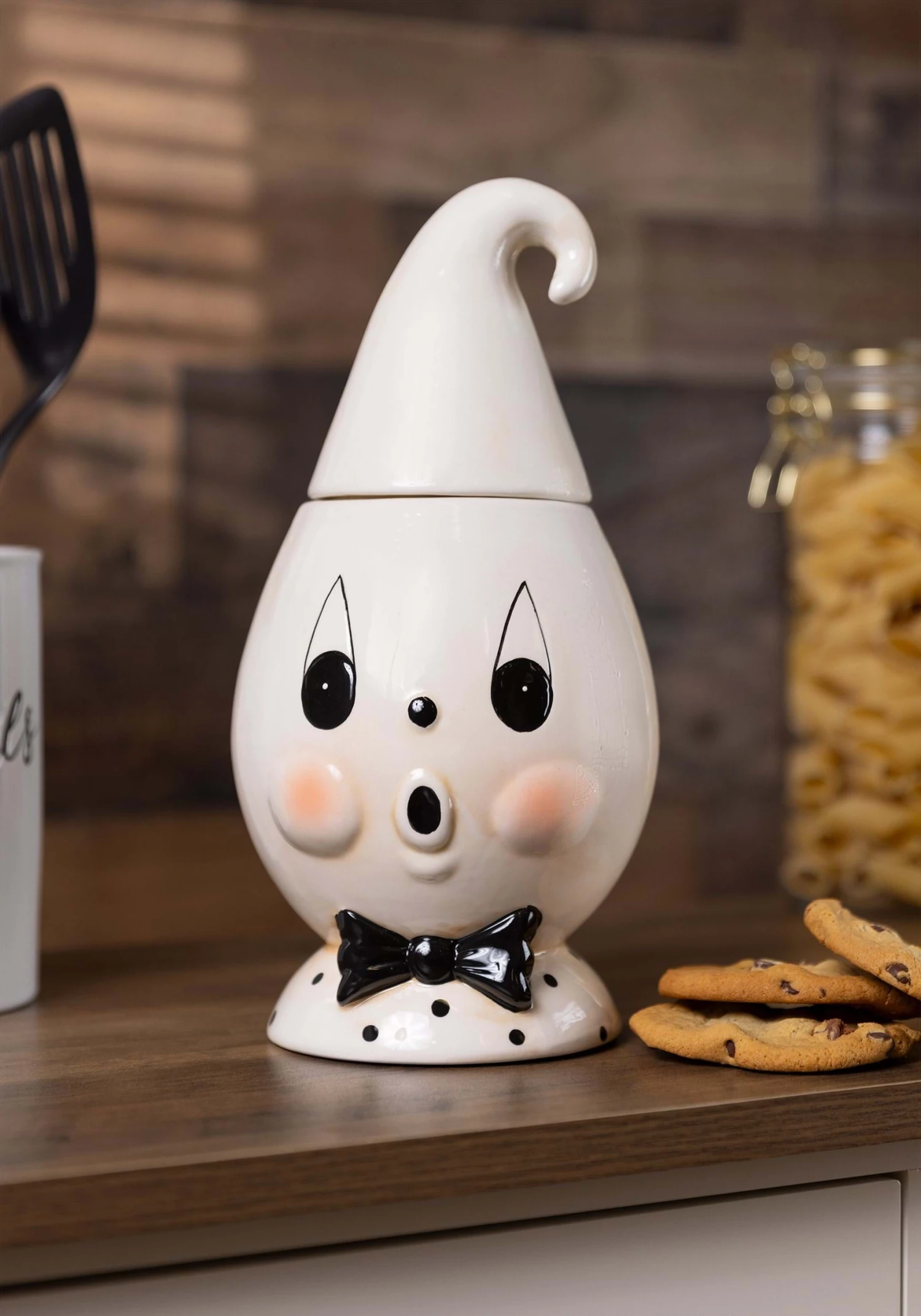 This adorable Johanna Parker Ghost Boo Cookie Jar Decoration doubles as a sweet centerpiece as well as convenient cookie container! The top of the ghost’s pointed head lifts off to reveal a spacious inner compartment to store your favorite treats.