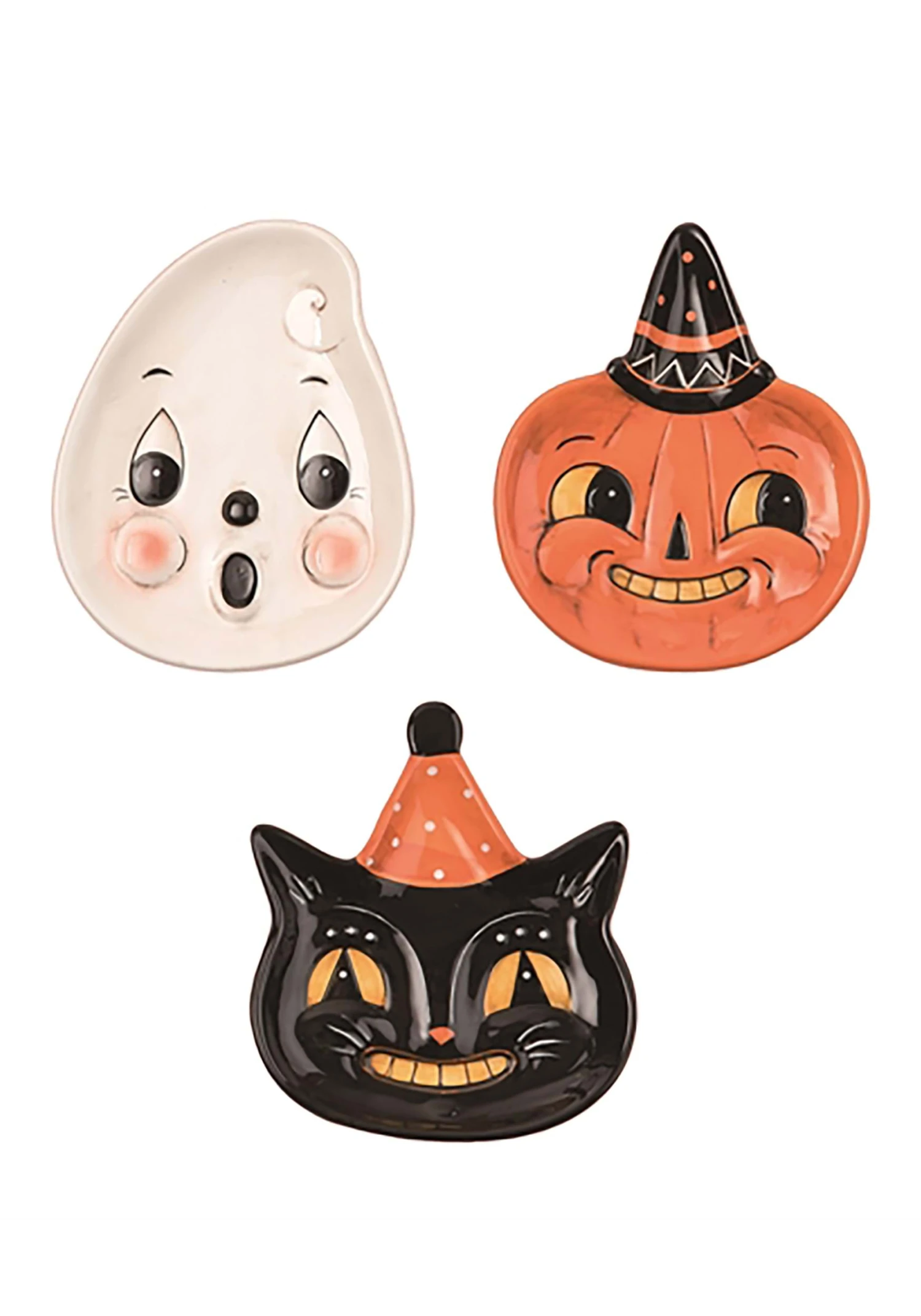 You’ve got your fake blood, enormous spiderwebs, and cackling witches up and ready to go. Now you need something cute to balance out the creepy! This Johanna Parker Set of Three Face Plates just fits the bill. The ceramic plates include one ghost face that’s clearly saying “boo!”, one smiling jack-o-lantern face, and one grinning black cat face. Adorable details like colorful hats amp up the “aww” factor. They’re ideal for decorating your home and for serving treats at your next party! Even a zombie would want to serve brains up on these cheerful plates.Â