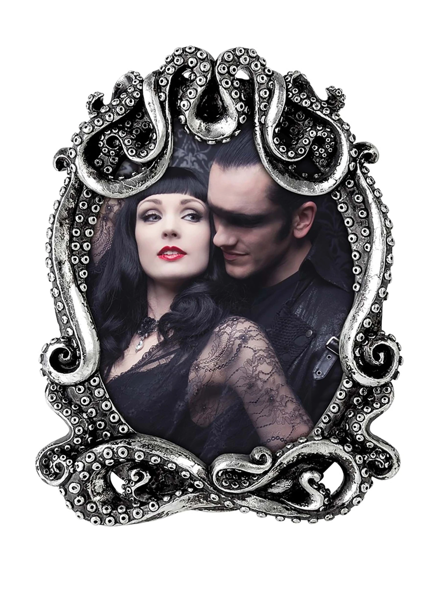Add some dark whimsy to your favorite photo with this Kraken Photo Frame! The silver-tone oval frame is molded to look as though suction-covered tentacles are draped all over the picture. It’s perfect for fantasy lovers and ocean enthusiasts!