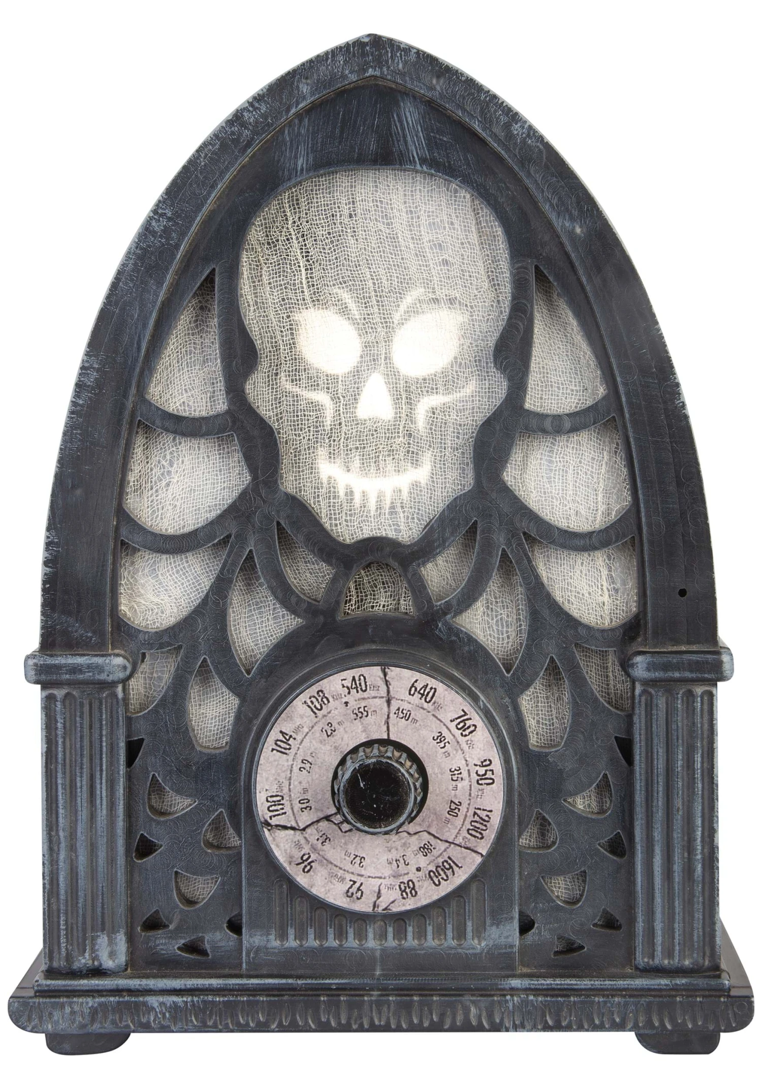 Catch your favorite spooky stations when you decorate with this Light Up 9″ Haunted Radio! This fun and unique decoration is shaped like an antique radio with a skull-shaped cutout and a cracked-looking dial. When activated, it lights and makes a variety of pre-programmed sounds.Â