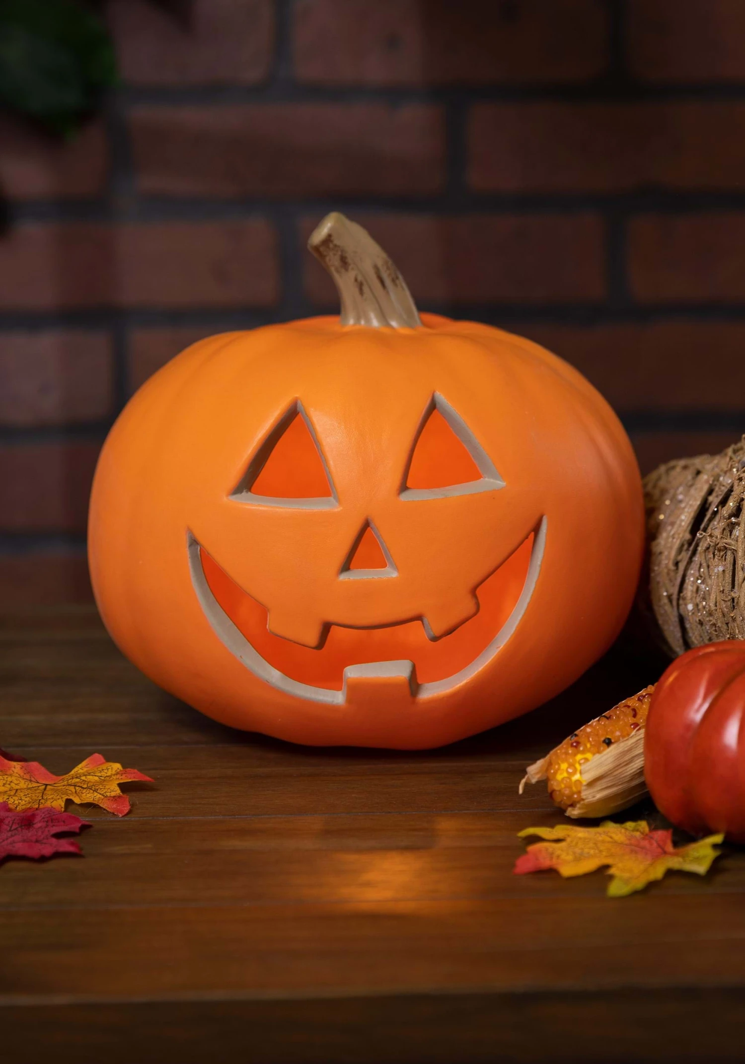 Ensure your Halloween décor isn’t missing its essential piece when you add this Light-Up Traditional Pumpkin to your display! The realistic-looking pumpkin provides a natural touch to your decorations, even if you miss a trip to the pumpkin patch. Sculpted from hard plastic, this pumpkin’s jagged, happy smile means you needn’t worry about carving or clean-up before or after Halloween! Plus, there’s no need for tea lights! The grinning gourd plugs in and glows!