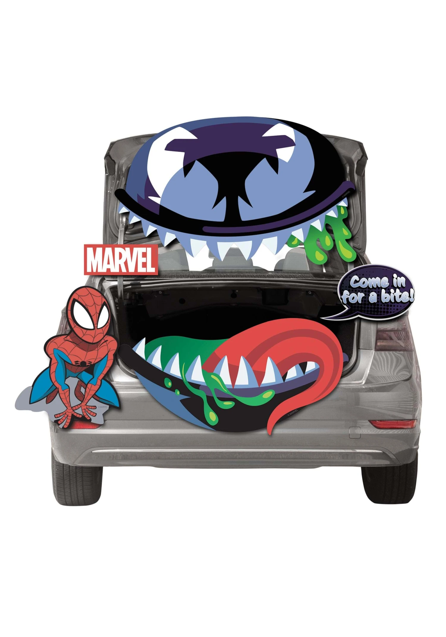 Bring everyone’s favorite antihero along for the ride this Halloween with a Marvel’s Venom Trunk or Treat Kit! Your car becomes a host for Venom with a giant lower jaw ringed with sharp teeth and drooling venom, with a pointy red tongue licking the lower lip. Venom’s eyes glare menacingly from another cutout. Other graphics include a crouching Spiderman figure, a Marvel logo, and a speech bubble that reads “Come in for a bite!”Â