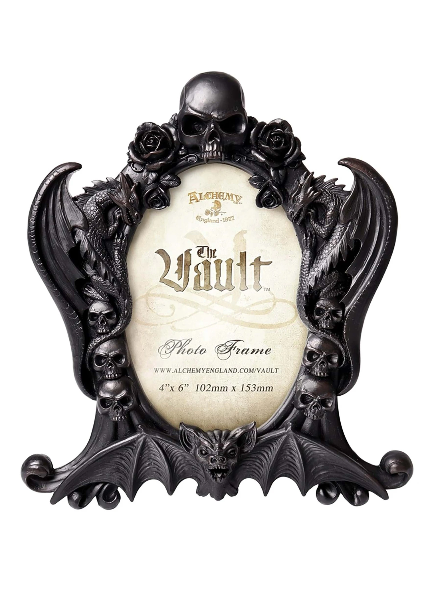The family picture wall is such a lovely trip through the past. We have so many wonderful memories captured in these frames. Here is where we got our first pet. Here is us waving from the edge of the Grand Canyon. Here is where we both became certified necromancers and detonated a ragged hole into the netherworld. Such fun! This Nosferatu Picture Frame will lend a sinister gothic air to any picture you showcase inside it. The molded black frame includes depictions of skulls, roses, dragons and a snarling bat.