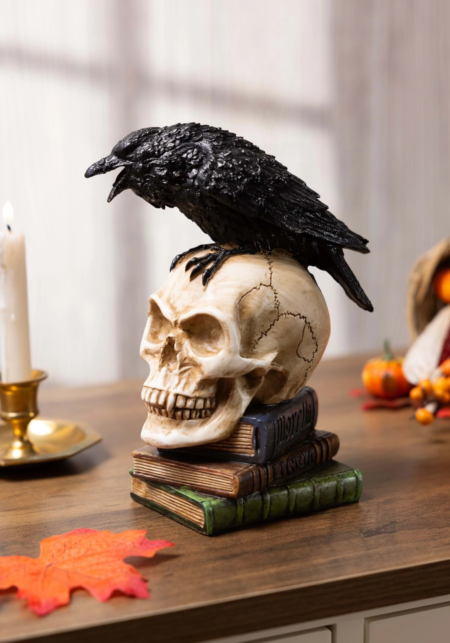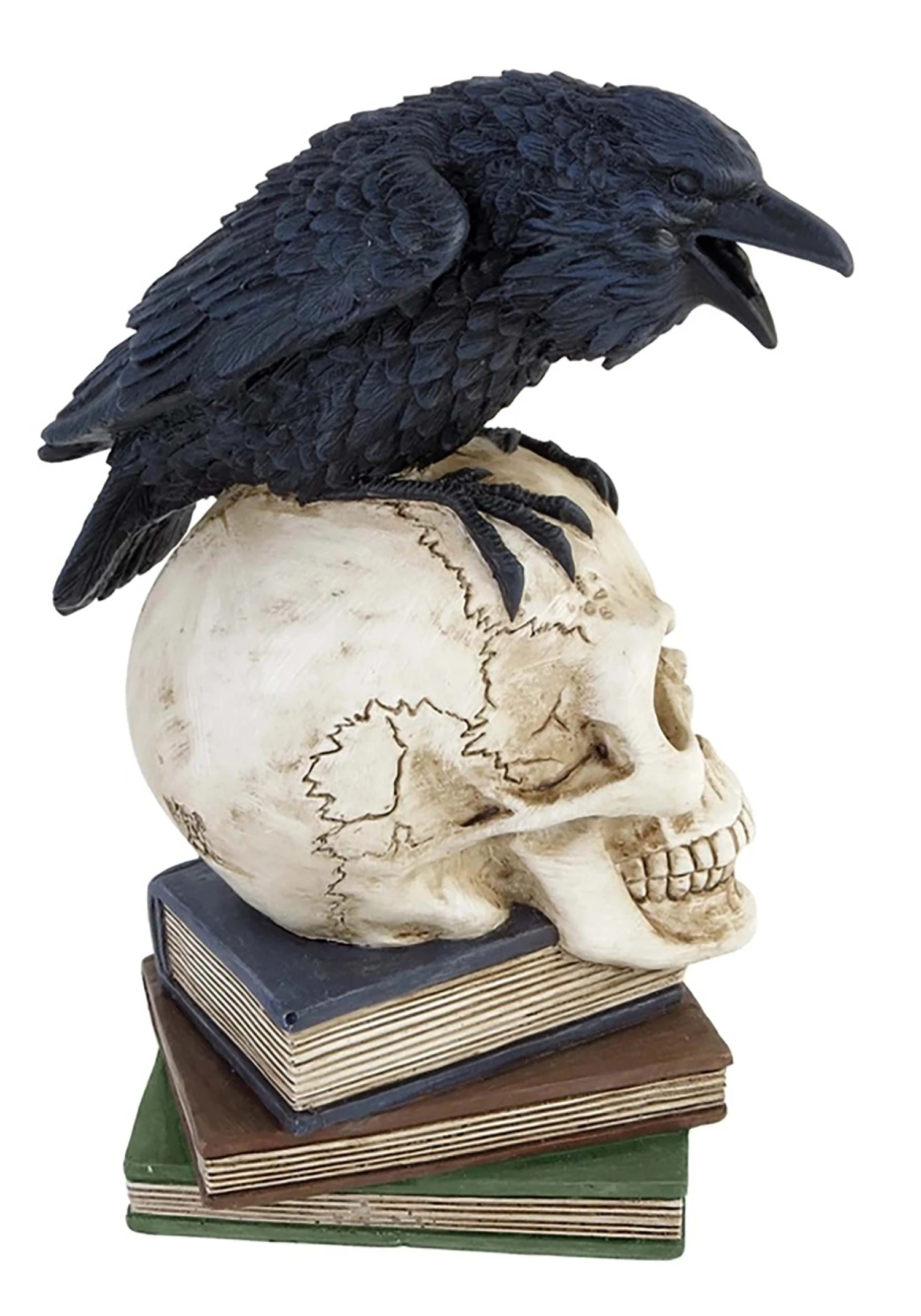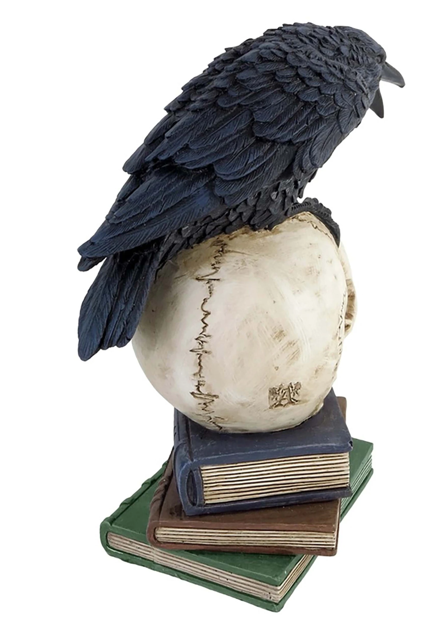 Of all possible unexpected visitors, a huge raven spouting depressing prophecies is probably the worst. There you are, perfectly content to sit by your fire on a melancholy winter night and brood about your lost Lenore, and the squawker won’t shut up. On the other hand, he really does add something to your poetically morose vibe. This Poe’s 8″ Raven Skull Decoration is an atmospheric addition to your spooky decor! It depicts a large, chatty raven perched on top of a skull and a stack of antique-looking books.