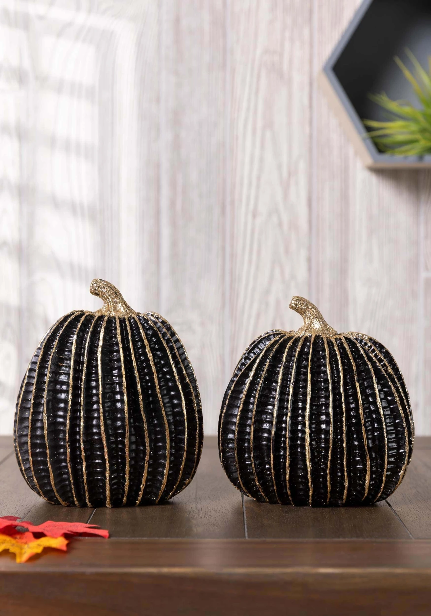 This set contains 2, roughly 6-inch pumpkins with a night-sky black base. Golden stripes adorn the ridges and textured details make these gourds look realistic. A golden stem also adds to their elegance. Place them in a pile at your entryway or use them to add drama to your buffet table!Â