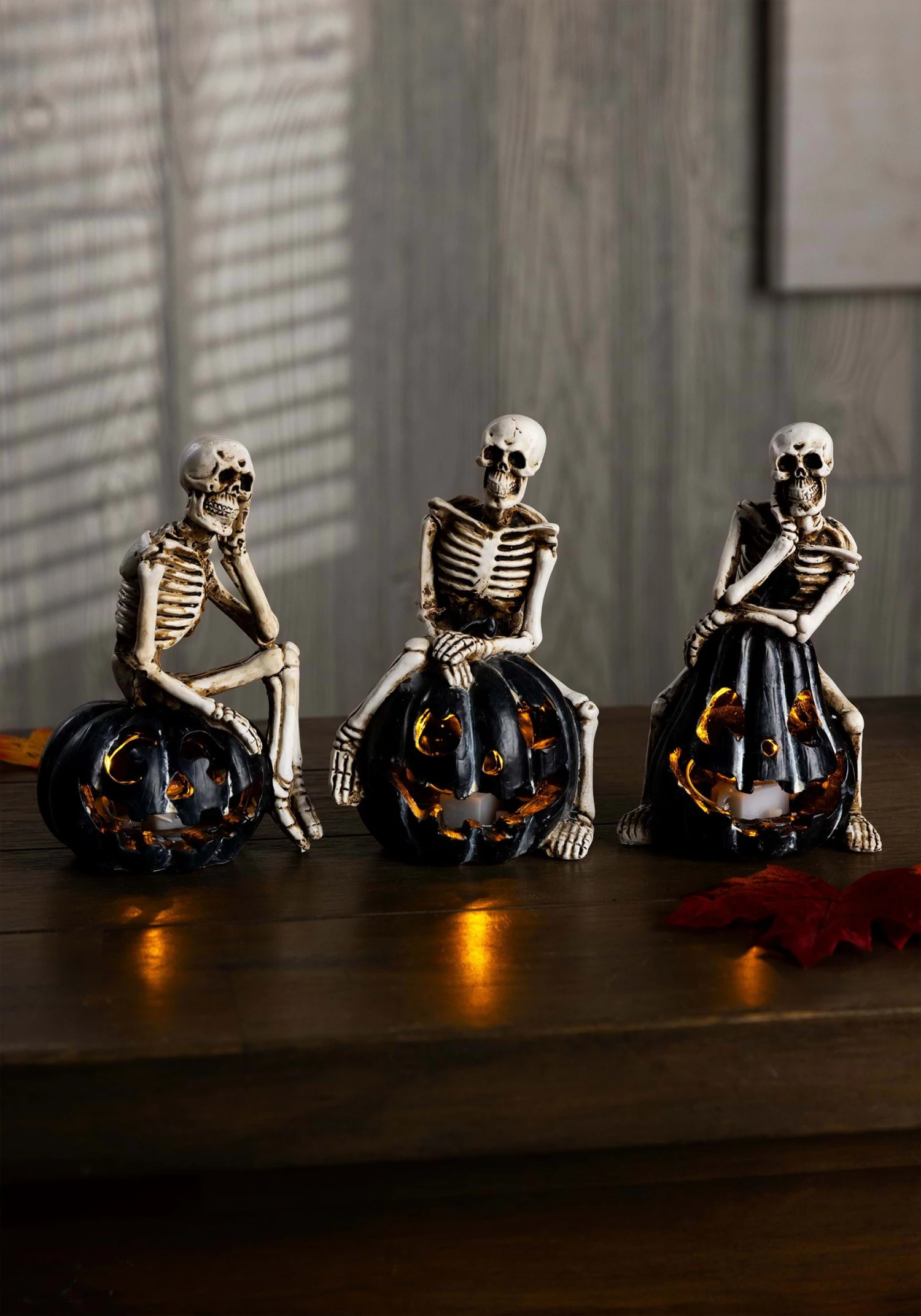 No need to be scared by these bony buddies. They’re not in the mood for spooking anyone. It’s way more fun to sit on a comfortable perch and watch the Halloween festivities unfold. This Set of Three Resin Skeletons Sitting on LED Jack O Lanterns show three skeletons in various relaxed poses lounging on top of grinning gray gourds. An LED candle inside each pumpkin lights up the scene spectacularly. The figurines can be displayed together or separately and make a whimsical addition to your Halloween decorations.Â