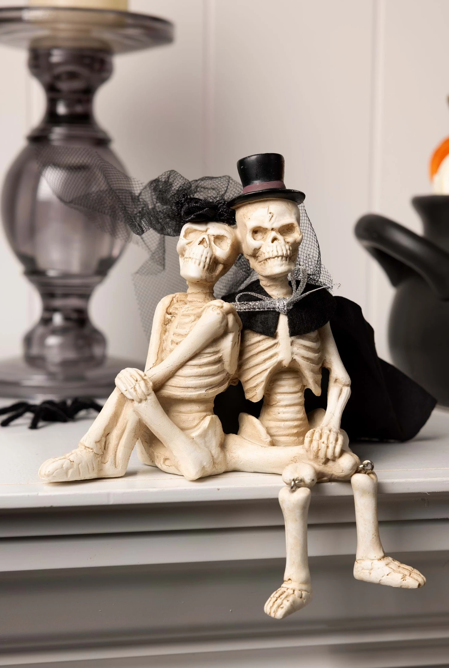 - Male skeleton has a satin cape, female skeleton has a mesh veil anchored by a satin ribbon rosette