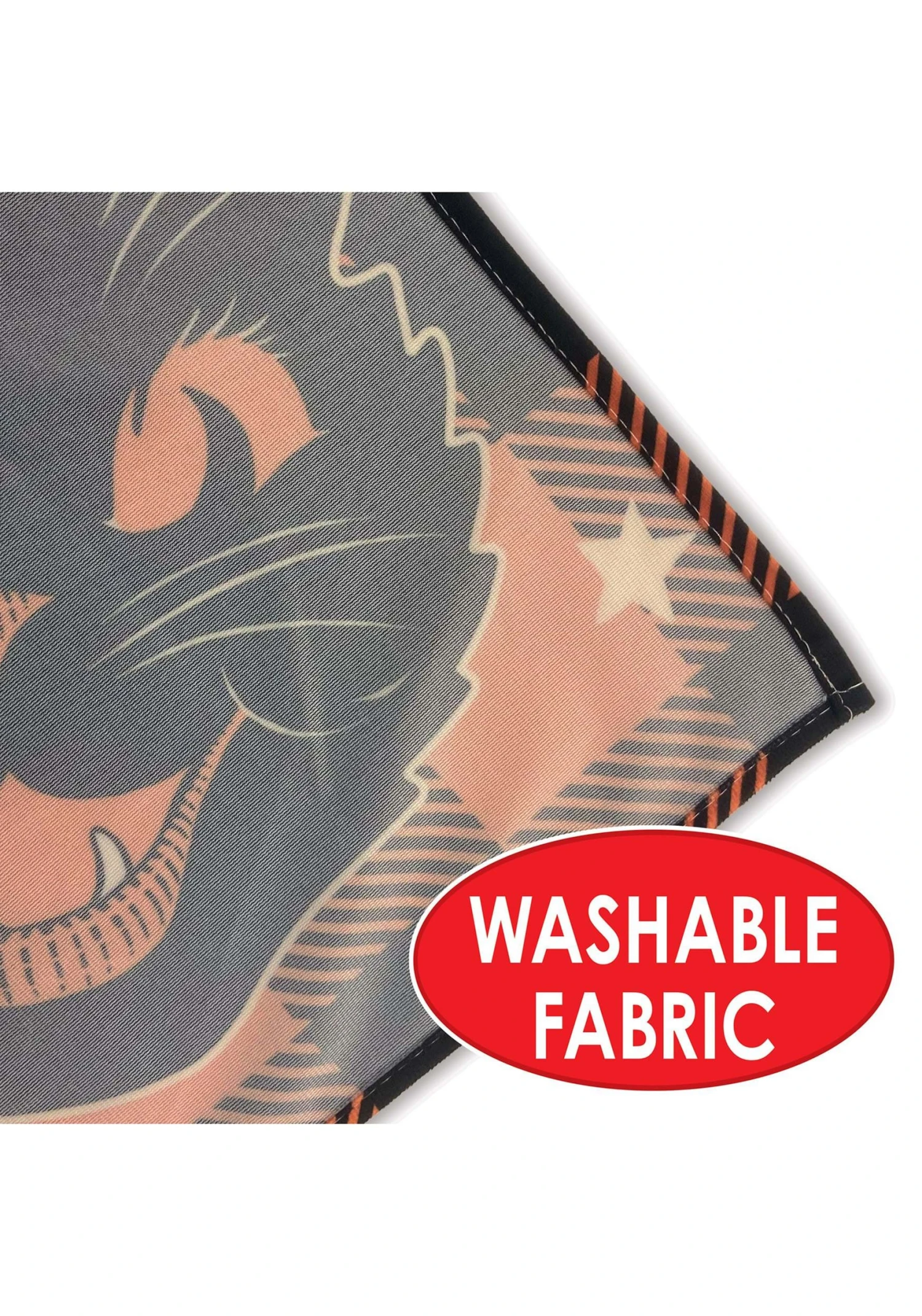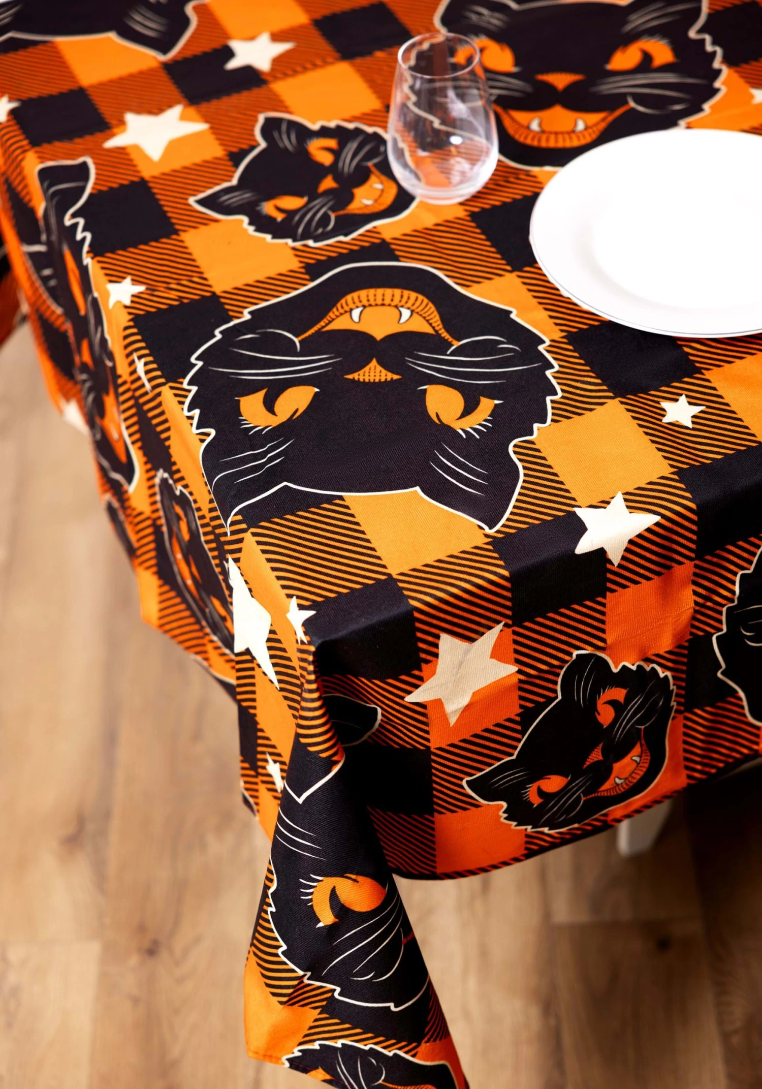 Serve up a delicious holiday using this Vintage Halloween Black Cat Fabric Table Cover! The rectangular tablecloth is printed with a retro-looking checkered background of orange, gray and black squares. Scattered all over are images of grinning black cat heads of various sizes and five-pointed cream stars.